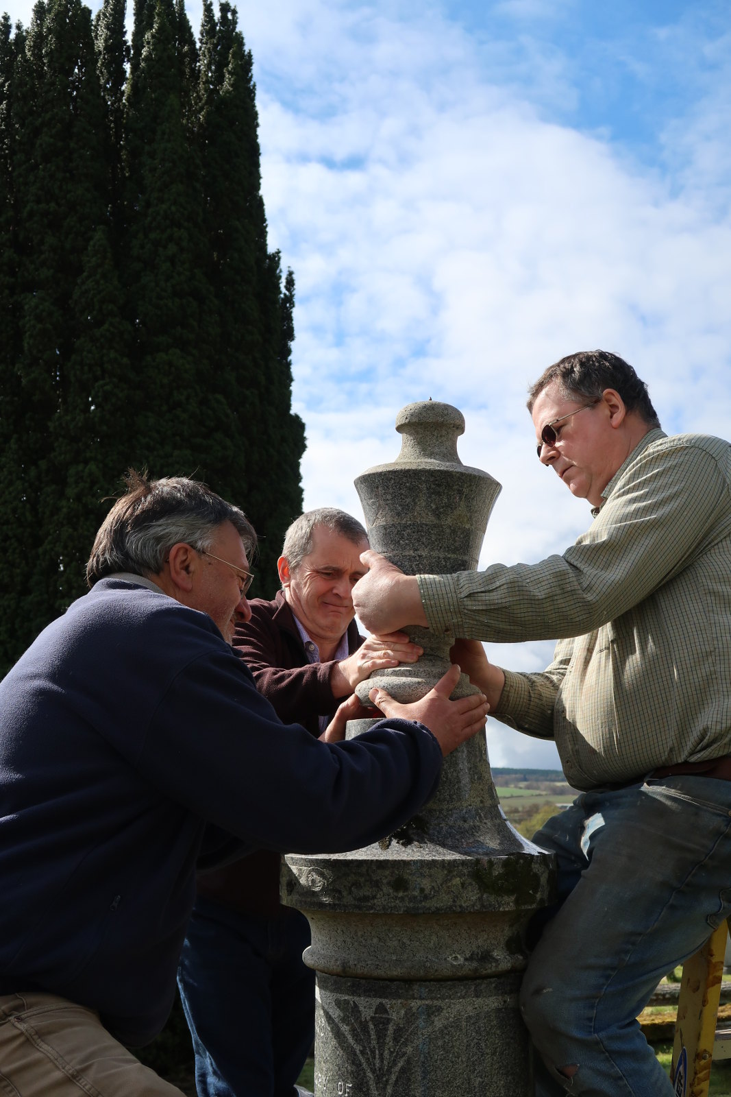 On this occasion, a hole was drilled into the urn, through the base and into the pillar, to allow a continuous stainless steel threaded rod to be imbedded with modern resin. We do not often show the volunteer effort that goes into restoration, but include it on this occasion for the record (photographs Andrew Dowsett and Davine Sutherland). Time will tell if this repair proves to be third time lucky!