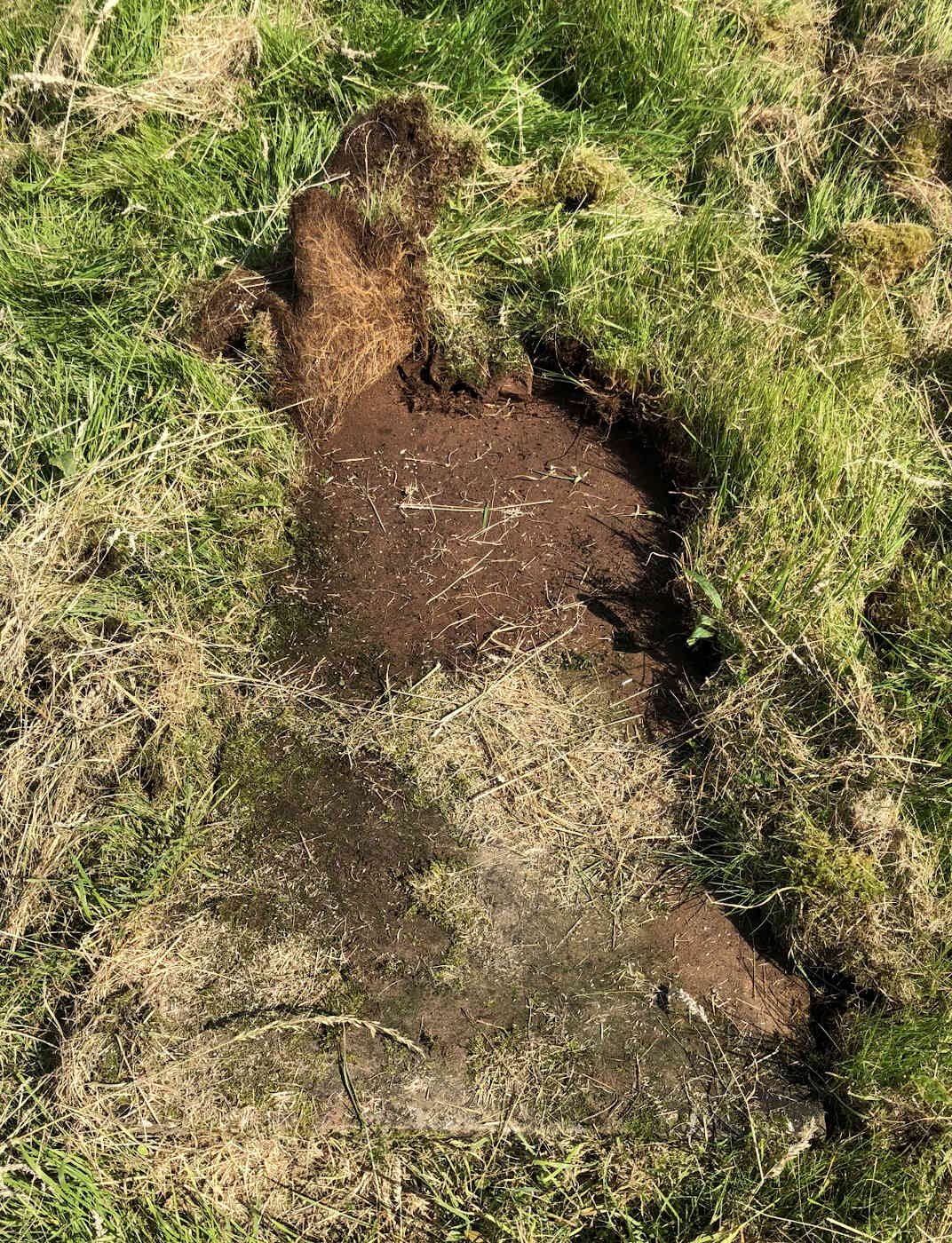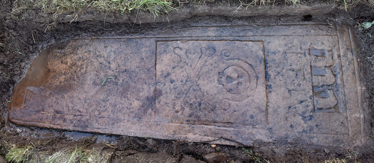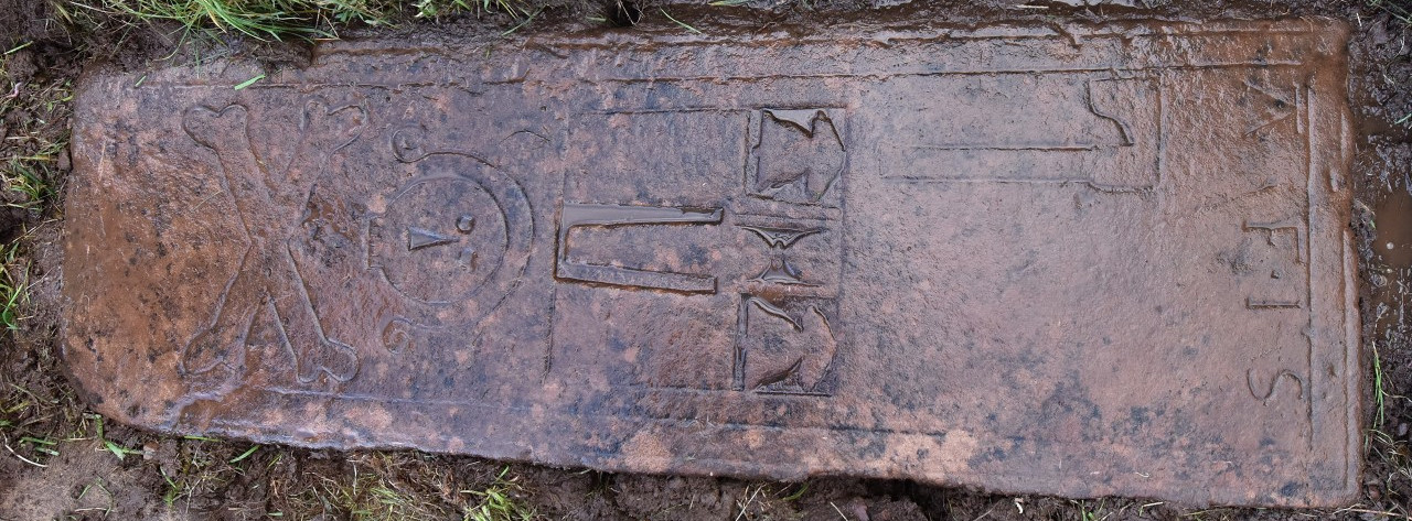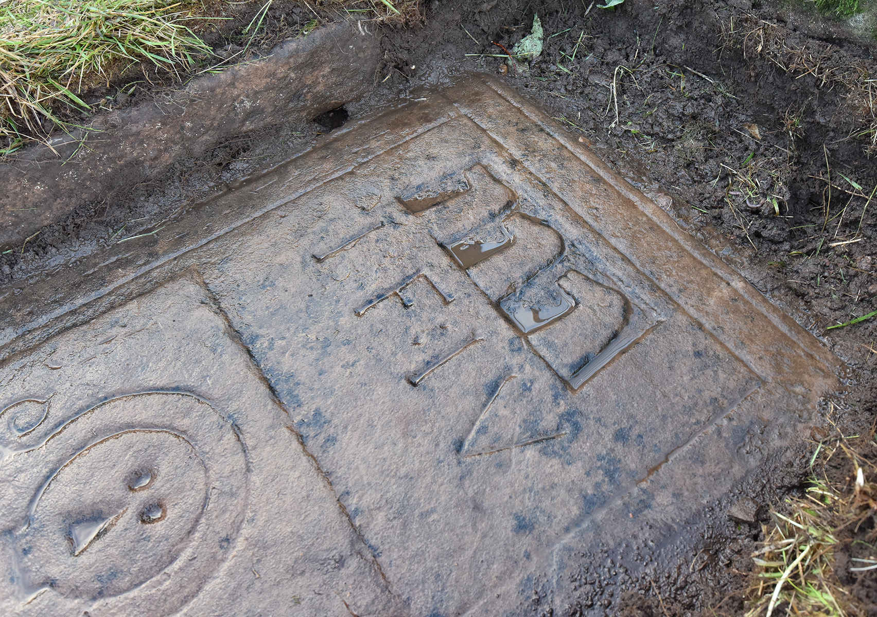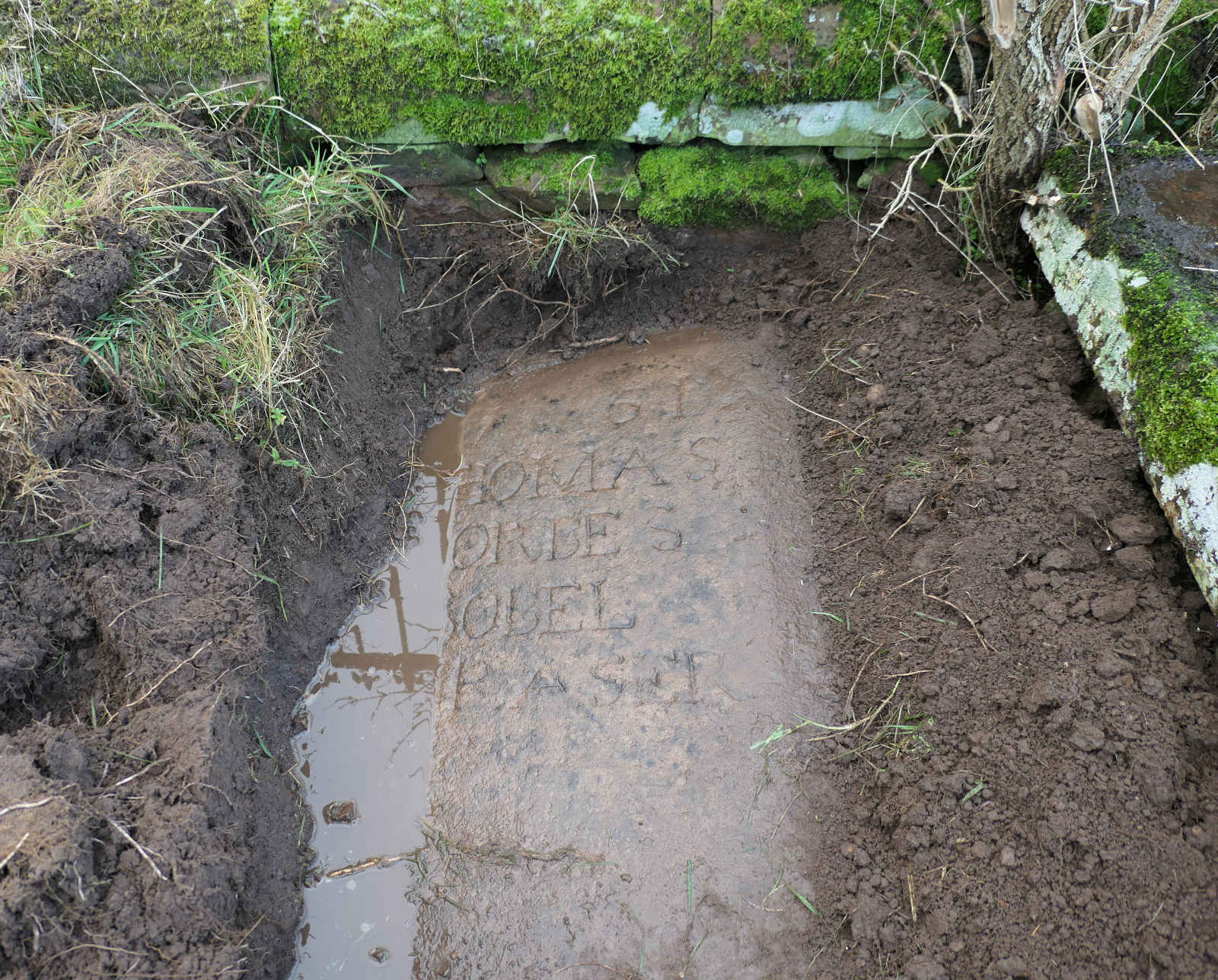 The slab is more deeply buried than the other Forbes slabs, and is tapered from head to foot, both features indicating greater age. The bewigged skull with its prominent teeth, above crossbones, would suggest (if they were original) that the slab was early 1700s. The double perimeter lines on older slabs would be filled with text, usually starting with the uninformative “Heir lyes ane honest man”, but the perimeter lines had become usually ornamental features by this time. There is just a suggestion of some lightly inscribed chaacters just above the incised panel and the next time this slab is exposed slanting light will be used to see what they say.