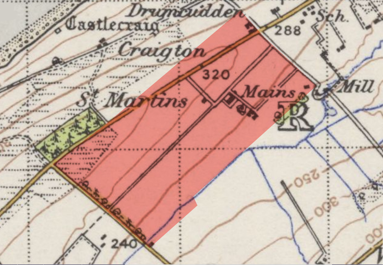 Nowadays few folk are aware of where the old Estate of Drumcudden was located, or its scale, so I have utilised the 1796 Estate Plan (RHP1469) to draw its approximate boundaries on a more modern base. St Martins Mains is located where the largest farmstead of “Easter Drumcudden” was.