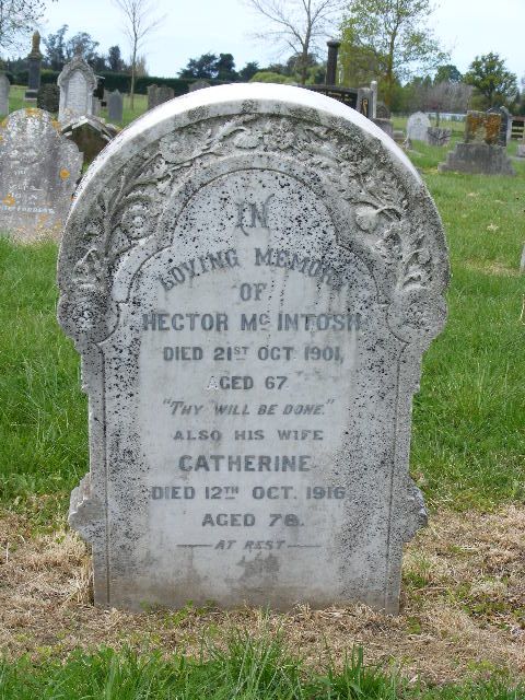 Catherine married ploughman Hector Mackintosh in Resolis in 1861 and after moving around several Black Isle farms they emigrated to New Zealand. Correspondent Kathy Williams is descended from Catherine and Hector and informs me that “My g grandmother and g grandfather are buried in Rangiora which is about 16 miles north of Christchurch and ten minutes away from where we live. Catherine McIntosh (nee Forbes) died on the 12 October 1916 aged 78 and is buried in the Presbyterian Cemetery, East Belt, Rangiora along with her husband Hector McIntosh who died on the 21 October 1901 aged 67. Their headstone reads “In Loving Memory of Hector McINTOSH who died 21 October 1901 aged 67 ‘Thy Will be done,’ Also his wife Catherine died 12 October 1916 aged 78. ‘At rest’”