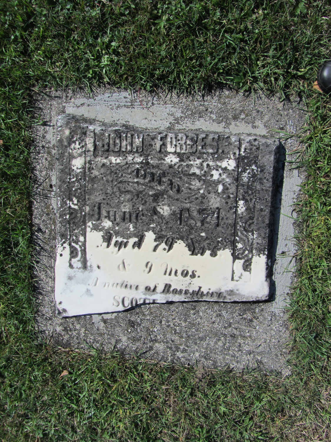 According to his gravestone in Nairn Cemetery, Midddlesex County, John Forbes died on 8 June 1874. There are several family stones in this Cemetery, and the following images are all drawn from FindAGrave.com. John’s headstone, which has been damaged, reads: