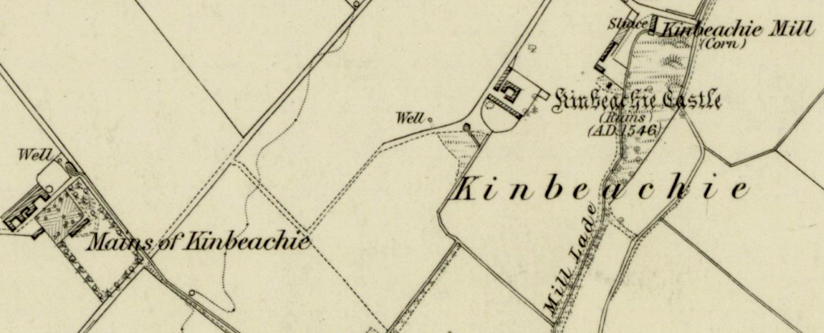 Kinbeachie Mill, beside the remnants of Kinbeachie Castle, demolished in the 1950s, and the Mains of Kinbeachie further west. The lade comes from Kinbeachie Loch; OS 6 inches to the mile, surveyed 1871–1875