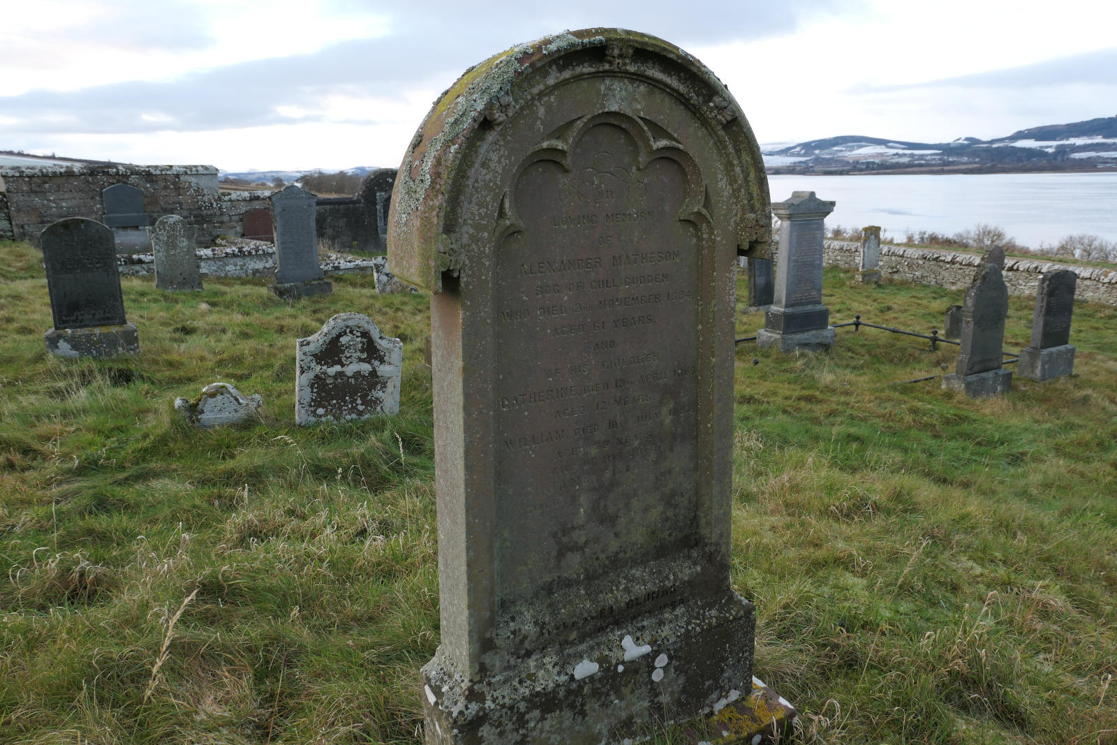 Jane married farm servant Alexander Matheson in Resolis in 1856 (she died in 1906, in the Bog of Cullicudden). They and their family are commemorated on a handsome sandstone headstone further east within Cullicudden Kirkyard.