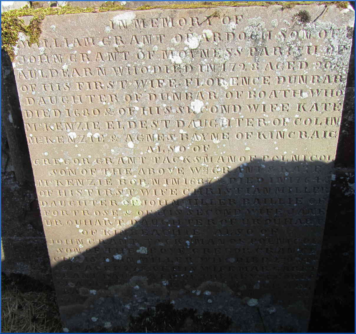 In memory of / WILLIAM GRANT of Ardoch son of / JOHN GRANT of Moyness parish of / Auldearn who died in 1728 aged 90 & / of his first wife FLORENCE DUNBAR / daughter of DUNBAR of Boath who / died 1680 & of his second wife KATE / McKENZIE eldest daughter of COLIN / McKENZIE & AGNES BAYNE of Kincraig / Also of / GREGOR GRANT tacksman of Polnicol / son of the above WM GRANT & KATE / McKENZIE born in 1687 & died in 1764 & / of his first wife CHRISTIAN MILLER / daughter of JOHN MILLER Baillie of / Fortrose & of his second wife JANE / URQUHART daughter of URQUHART of Kinbeachie Also of / JOHN GRANT tacksman of Polnicol / son of the above GREGOR GRANT & CHRISTIAN MILLER who died 2d Octr / 1810 aged 77 & of his wife MARGARET / GRANT daughter of the Revd GEORGE / GRANT Minister of Kirkmichael / Banfshire She was born August 1739 & died 24th Decr 1824 & is buried / in Nairn Also of their / daughters who died unmarried viz / JANE died 1st April 1810 aged 30 & / MARGARET died 15th August 1816 / aged 32 Also of their / granddaughter FRANCES daughter / of their eldest son GEORGE GRANT / London she died in July 1823 aged 20 / & is buried here.