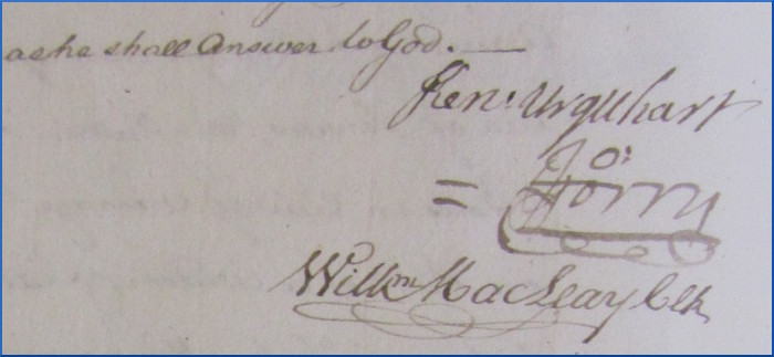 22 October 1762 / St Martins Compeared Kenneth Urquhart Tennant in St Martins, who being Solemnly Sworn and Interrogate Depones that he pays yearly Twenty three Bolls Oat–Meal as the Rent of the miln of St Martins, That he Also pays Thirteen Bolls & two firlots Land rent, with a merk per Boll in lieu of Services, one Shilling Scots per Boll in lieu of Vicarage Teinds, and two and a half Wedders, twenty four hens, Depones that the said Thirteen Bolls and a half land Rent Includes William Bremner’s Boll Croft, and Hector Urquhart’s firlot Croft – And which respective Rents are ascertained by a Tack now produced by the Deponent Entered into betwixt the said Mr. Charles Hamilton Gordon & him dated the 22d. Octor. 1754, for the Space of Nineteen years from and after the term of Whitsunday 1753, Depones that he has no mailler nor Subtenant paying Rent to him, And all is truth as he shall answer to God. / Ken. Urquhart / Jo: Gorry / Willm. MacLeay Clk