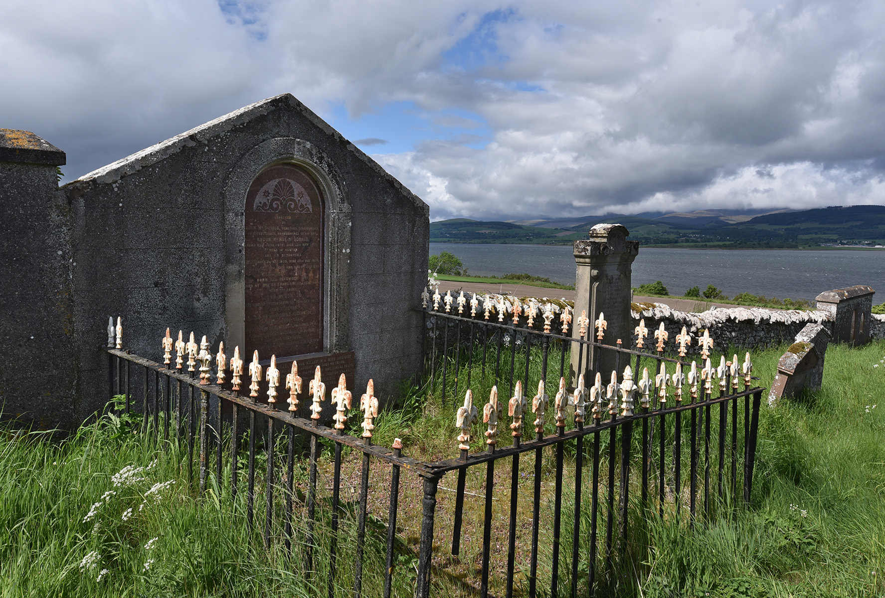 the enclosure and wall memorial to John Macdonald and family – the tower of Castle Craig appropriately just appears on the right; photo by Andrew Dowsett