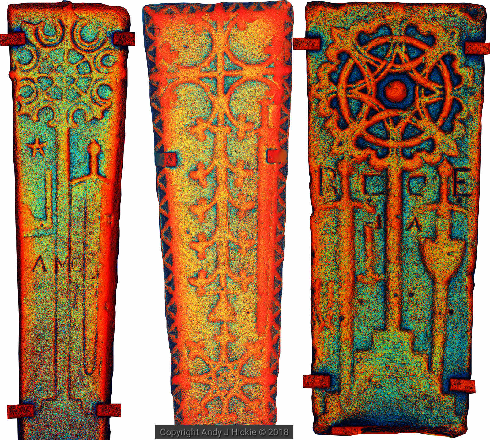 Three wonderful medieval crosses in false colour photogrammetry in the nave display at Kirkmichael.