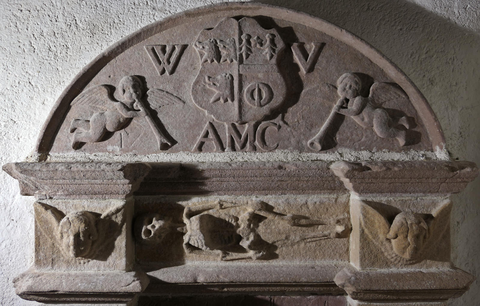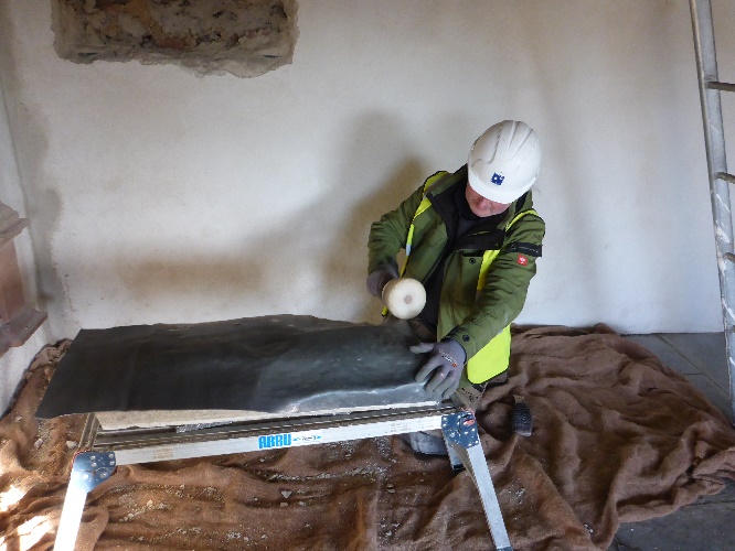 The stone itself is most unusual. To the visitor it simply looks like a thin, flat panel. However, when we had it removed from the wall for conservation in 2017 we found that it bulged out irregularly right into the wall!