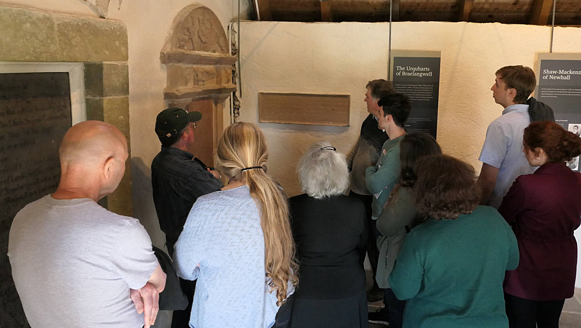 In July 2018, I was able to show the now largely deciphered panel to a group of Clan Urquhart members, including the redoubtable Dowager Urquhart of Urquhart, when they were over from America. The chieftainship descends from Urquhart of Braelangwell so both this panel and the elaborate memorial beside it are of particular interest to the clan!