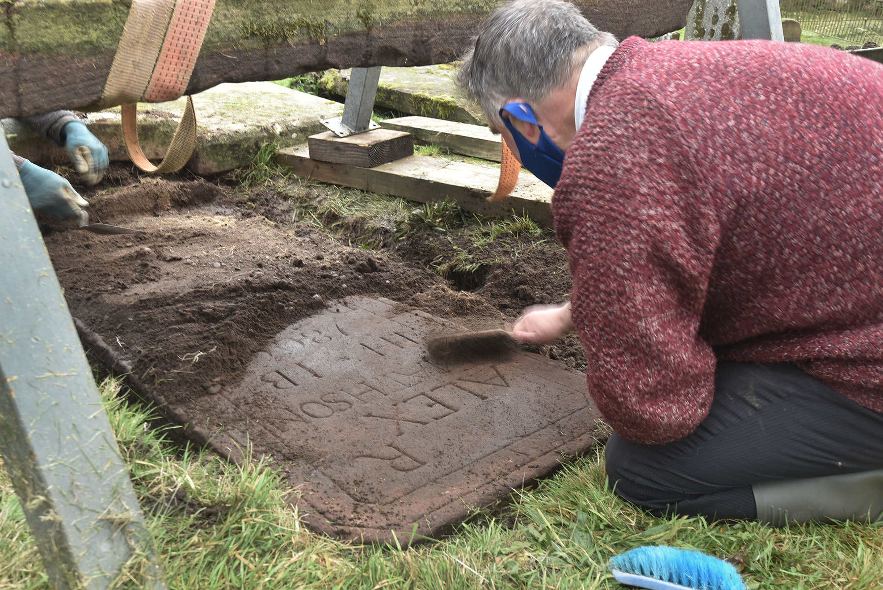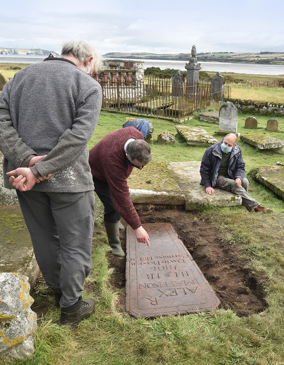On 15 August 2020, when we were recording a buried memorial slab in the centre of Kirkmichael, George noted that the foundation slab of the Urquhart shoemaker headstone he was working beside had some letters carved on it. He cleared away the soil and, astonishingly, enough of the inscription was visible to distinguish the name. The other volunteers clustered round.