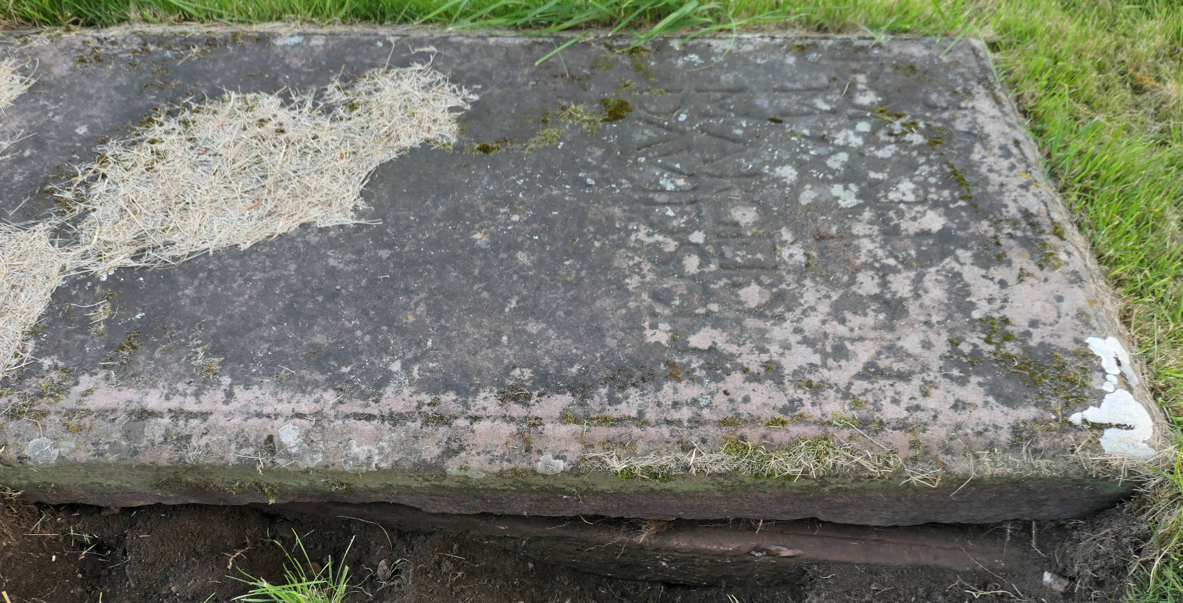 My tentative view is that an earlier slab put in place to commemorate the couple was replaced by a much smarter slab with a fine chamfer and bordering line, rather than the rough sandstone slab previously in place.