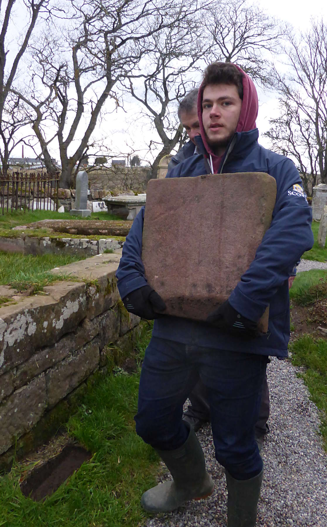 There were plenty more willing hands at the Kirkmichael end to return it to its previous location. A neat hole was excavated a few inches from where the headstone had previously stood and the oddly-shaped base disappeared underground to leave the neat top standing as if it had never been disturbed.
