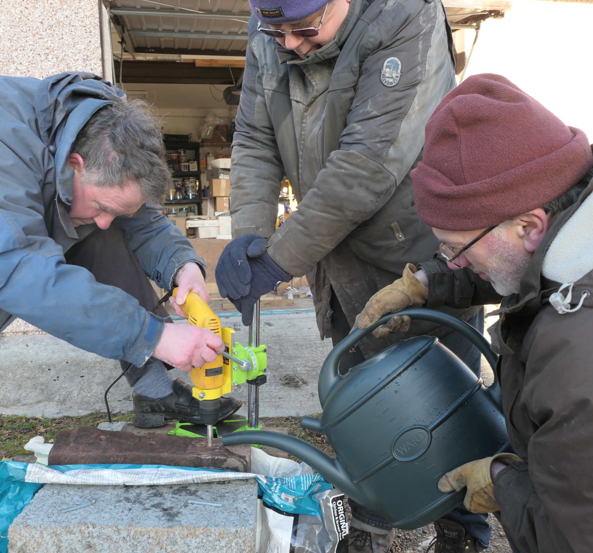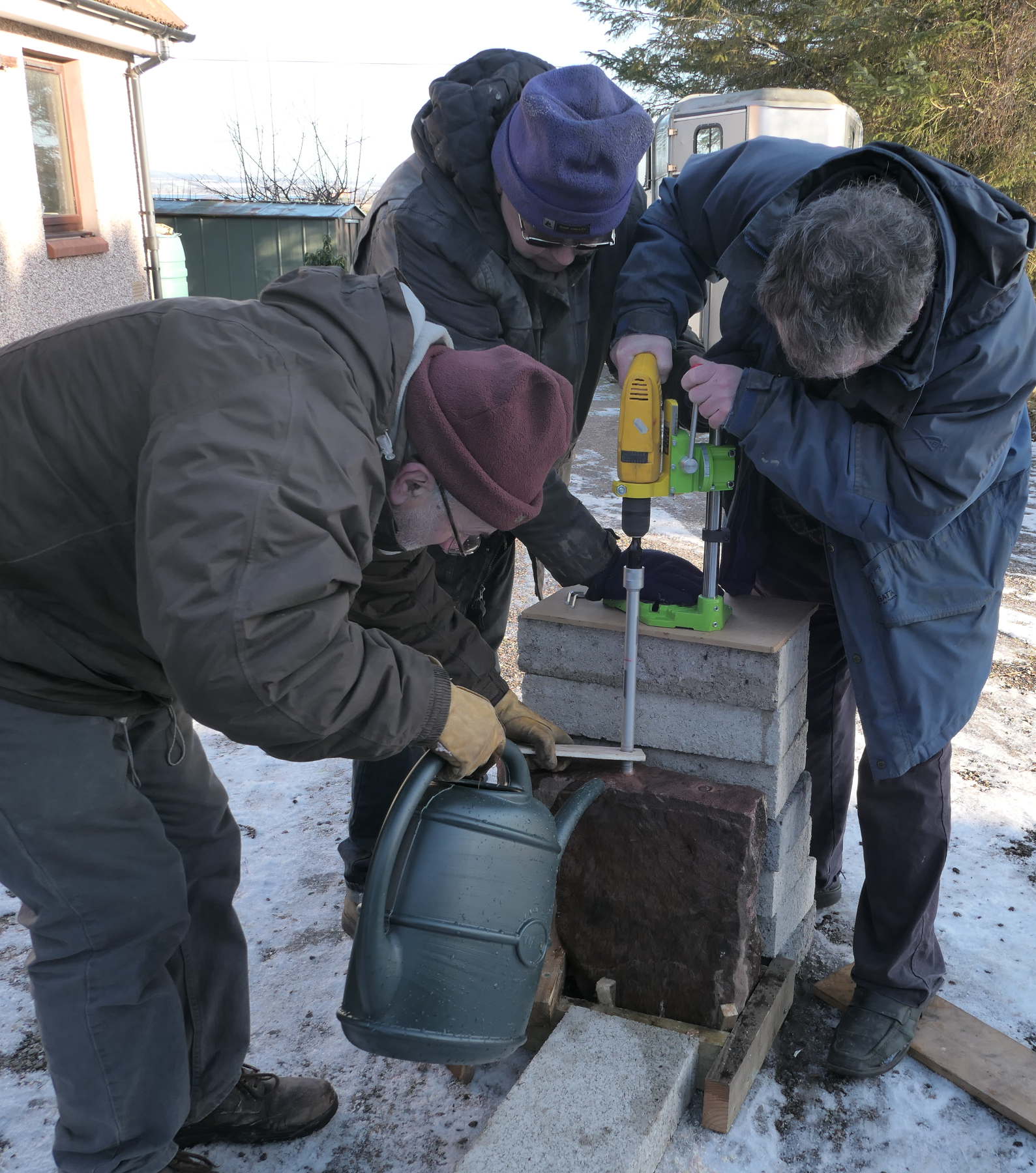 Having washed out all the drillholes (the stone surface has to be scrupulously clean for anchor resin), we carried the two halves into my living room to dry out. The top was easy to work with as it stood quite happily on any of its edges. However, the base had to be mounted in a wooden support with wedges to keep it firm. When dry the two halves were joined in February 2019 with three stainless steel threaded rods and anchor resin.