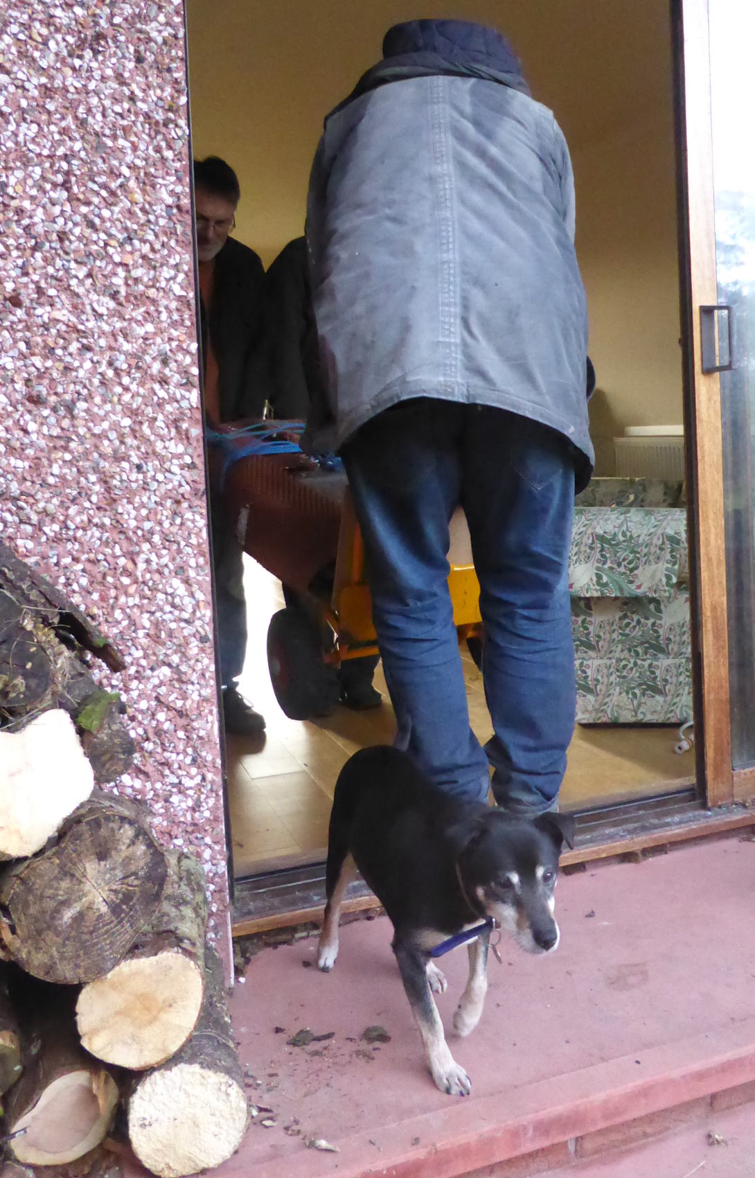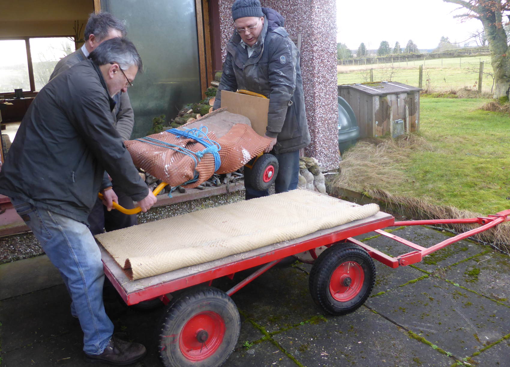 A slight problem then arose. While a strong person could carry each half into the house, getting the joined headstone outside again was more challenging! And there are many stumbling points getting down our patio. We solved the problem by wrapping the stone in rubber underlay and lashing it to a sackbarrow and three of us carrying the sackbarrow out to the old Kirkmichael Cartie, which in turn was pulled into the waiting horse-box.