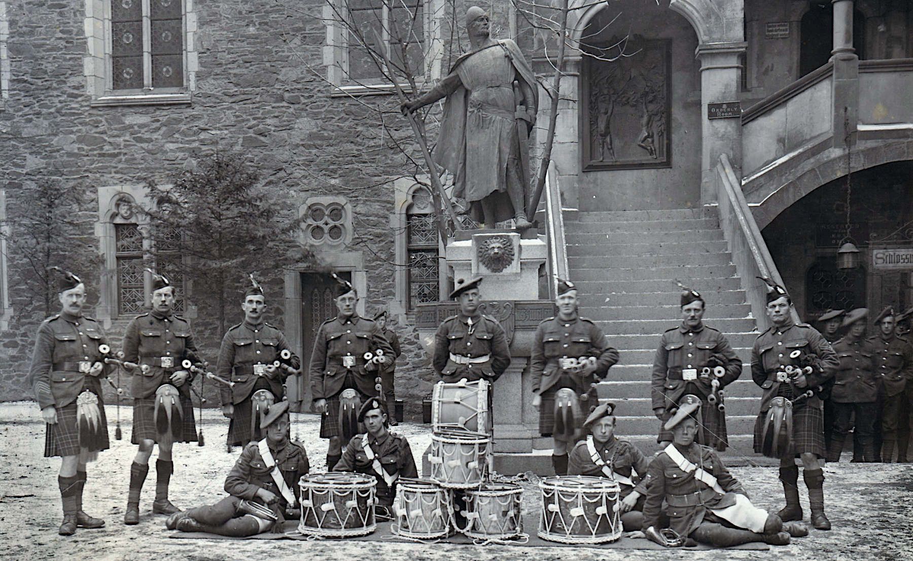 The 1st Battalion Pipes and Drums at Schloss Berg in 1919, the year that John Wemyss was discharged; thanks to King’s Own Scottish Borderers Regimental Museum for the original photograph