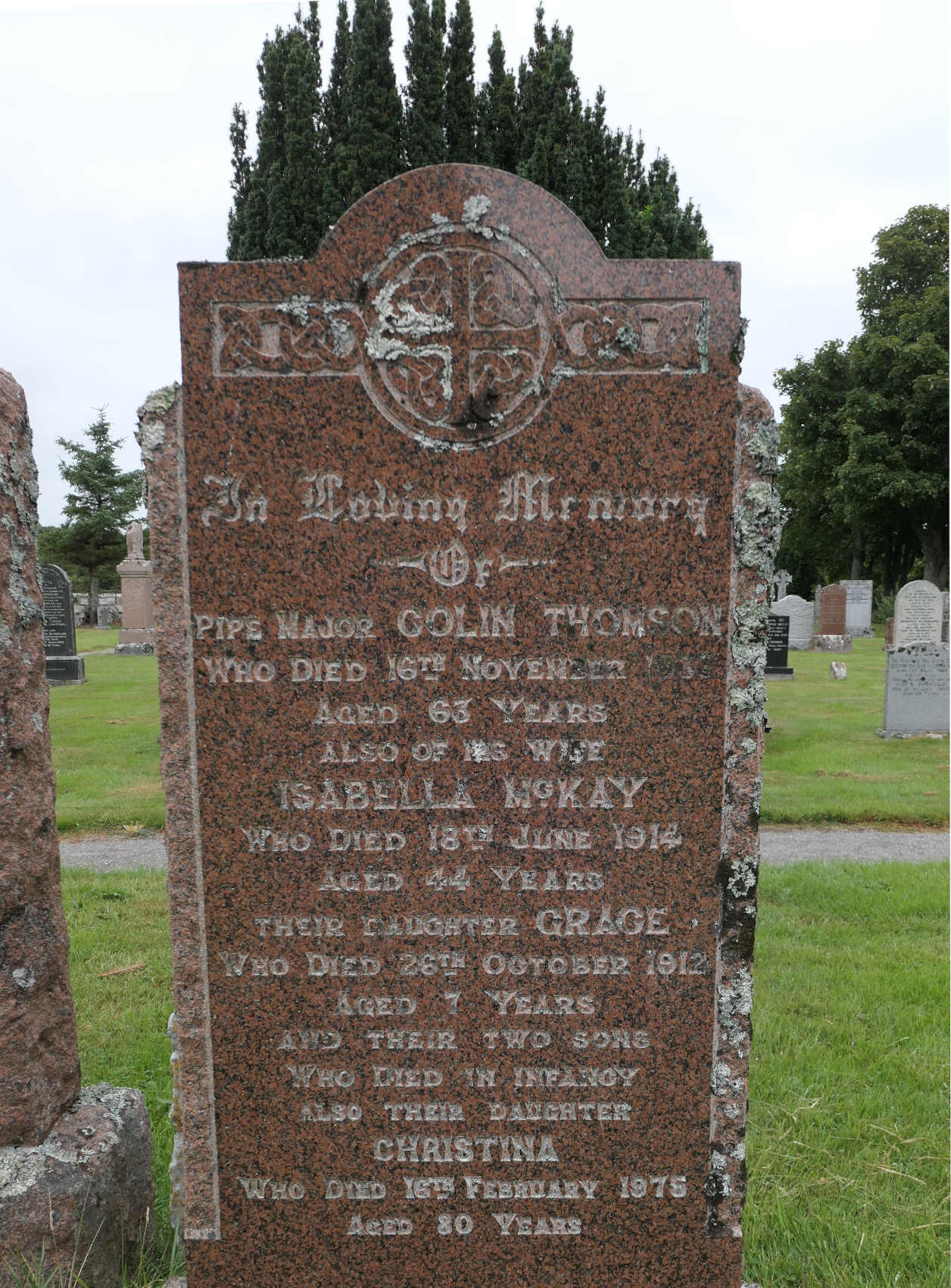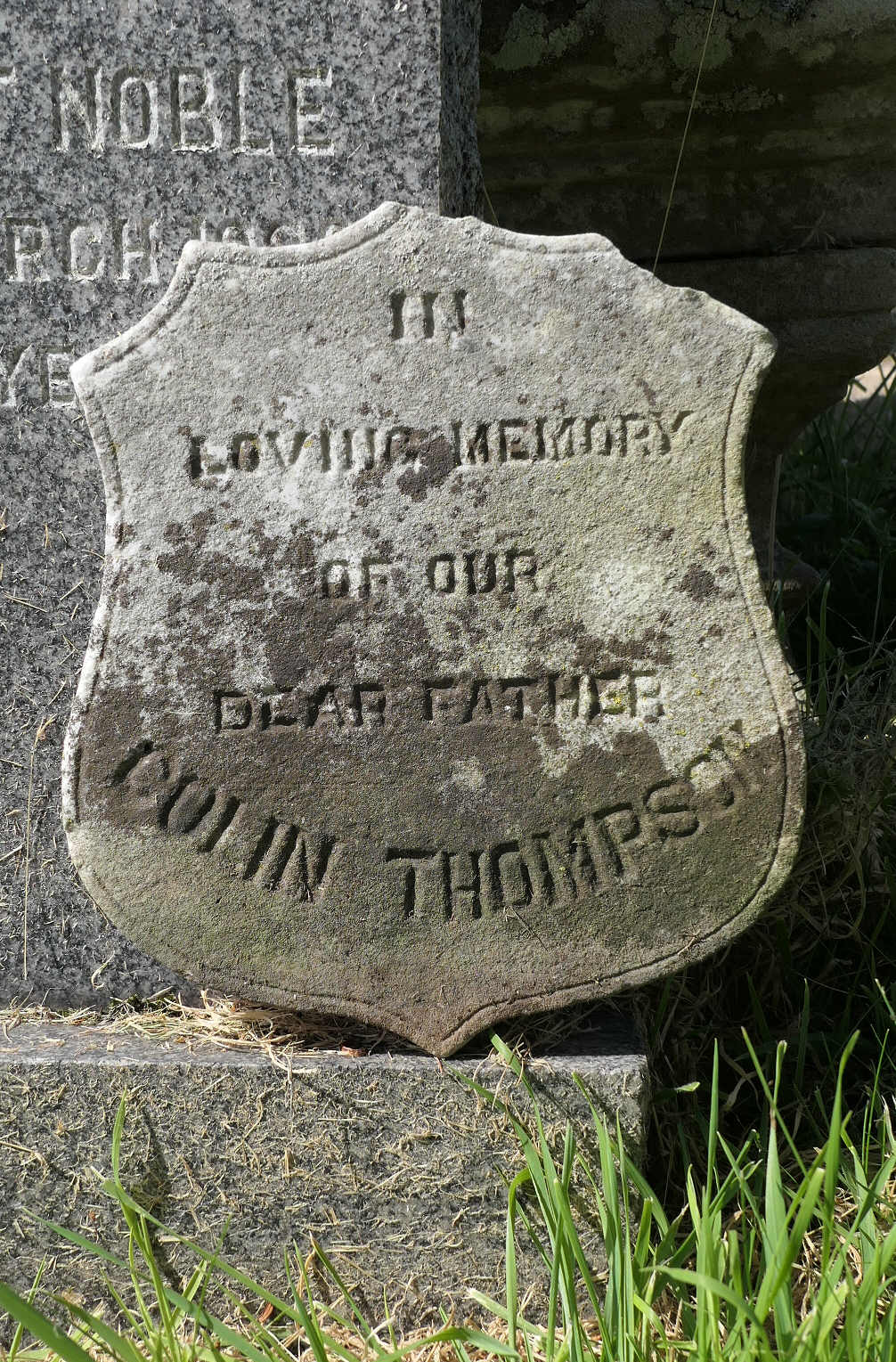 the Colin Thomson plaque is usually tucked behind son Hugh’s headstone; photo by Jim Mackay