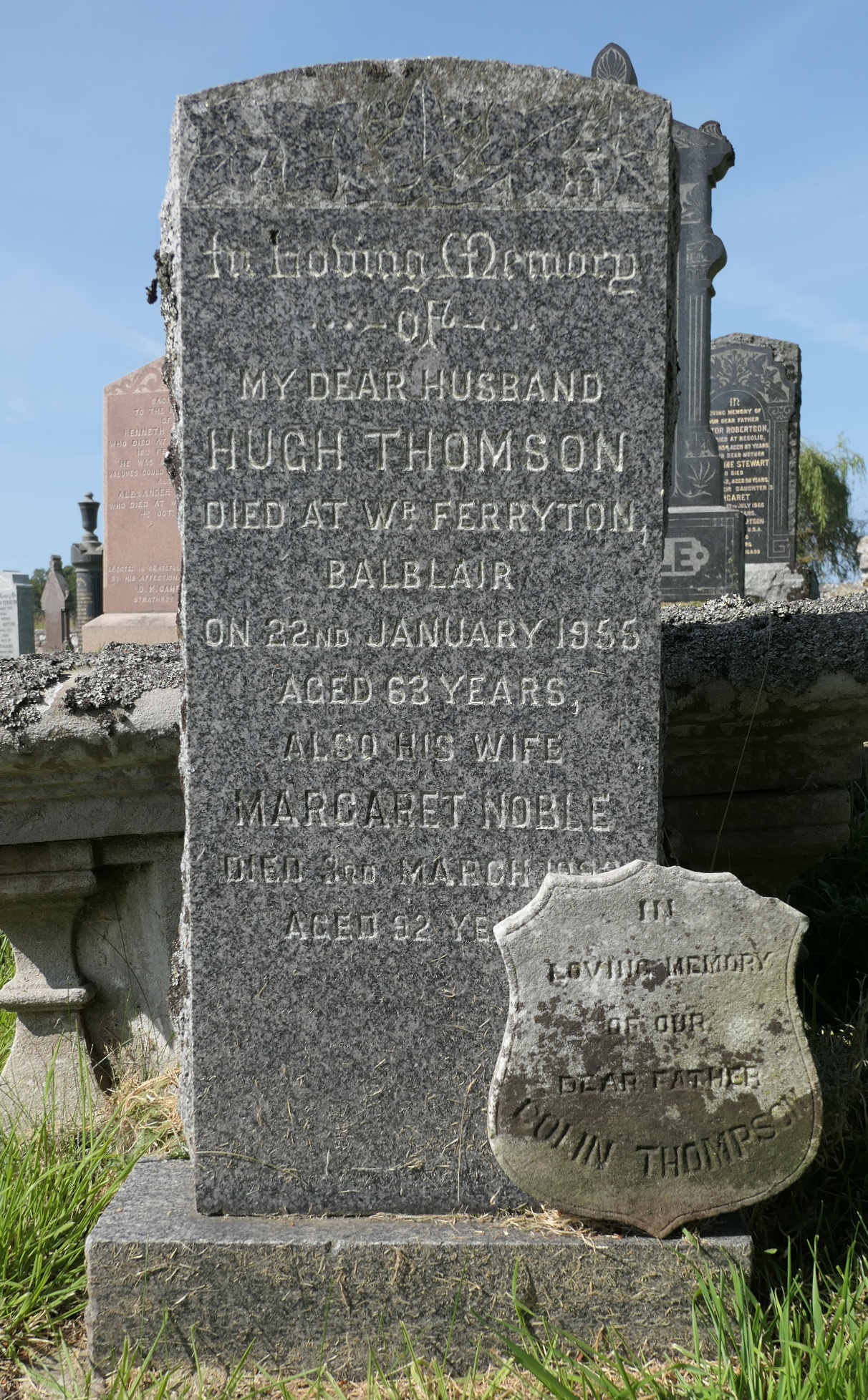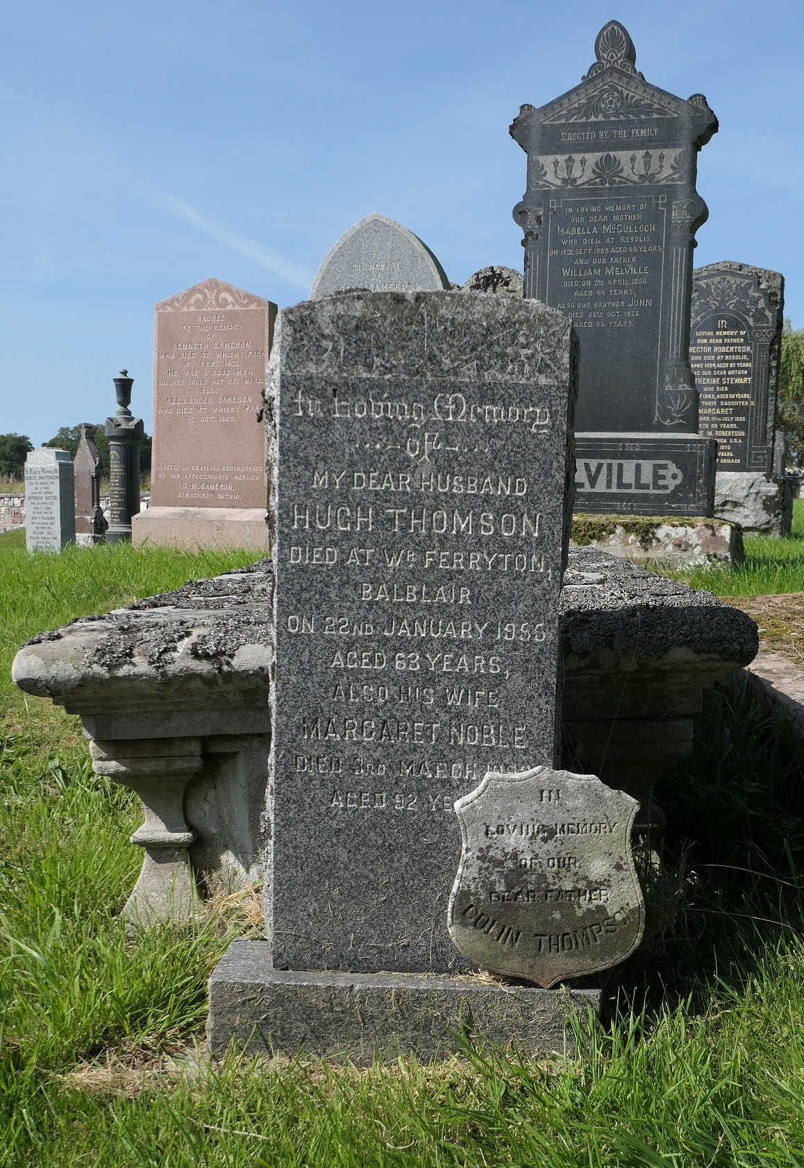 Father Colin Thomson of Ferryton married another woman, Jessie Gray, in December of that same year of 1869, and their family continued to live and work in Ferryton, in the croft known as “Inch Cottage”, until relatively recent times. A small marble plaque in Kirkmichael commemorates Colin Thomson of Ferryton; it is tucked behind the headstone memorialising his son Hugh.