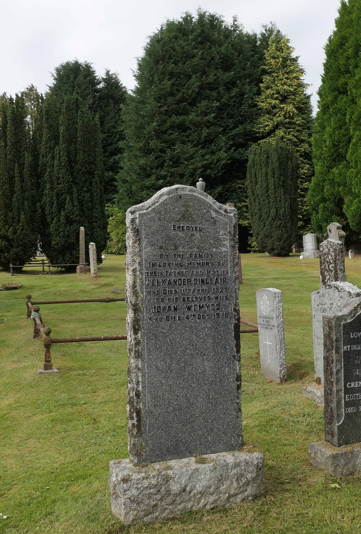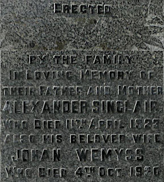 Erected by the family in loving memory of their father and mother ALEXANDER SINCLAIR who died 11th April 1923 also his beloved wife JOHAN WEMYSS who died 4th Oct. 1930.
