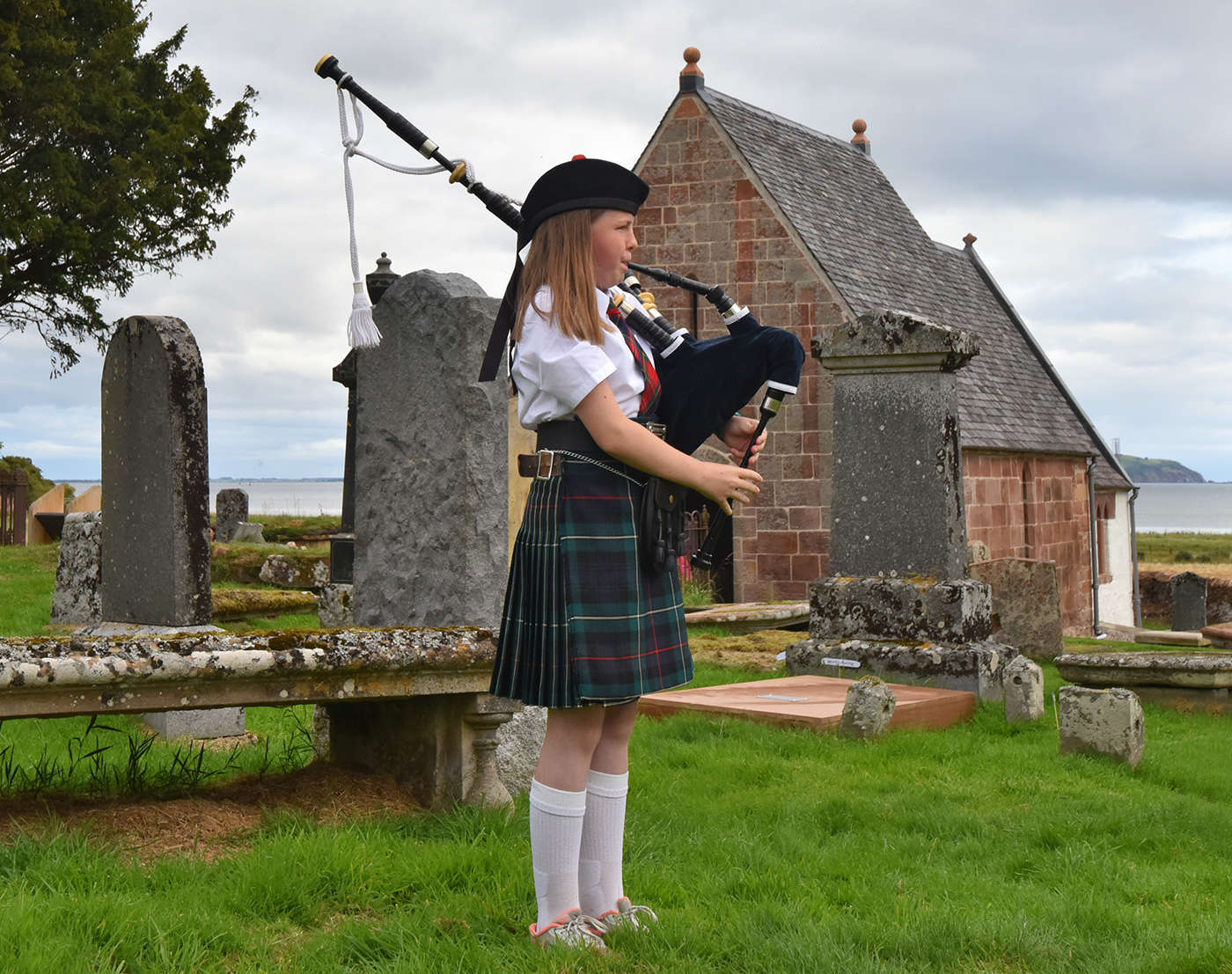 Lucy McIver pipes up a storm at Kirkmichael; photo by Andrew Dowsett