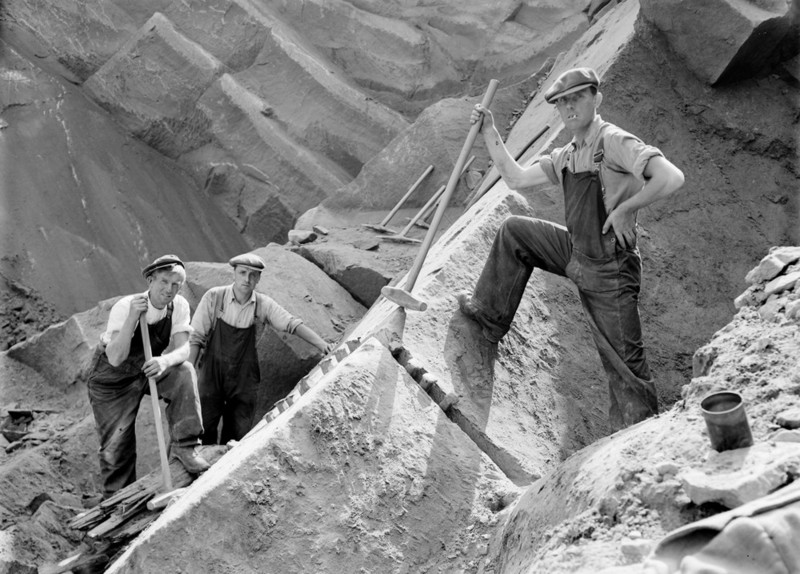 A sandstone block in a quarry being cut to the desired size by tapping a row of wedges in sequence until it splits; image courtesy of the British Geological Society