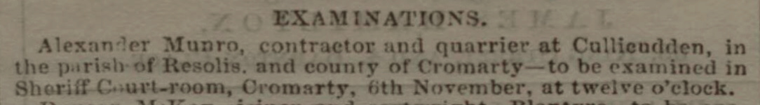 The national papers all contained the details of the sequestration process as was normal in those days; there was no place to hide. And in the National Archives in Edinburgh (under CS318/7/200) there is a collection of documents relating to the Sequestration of Alexander Munro Contractor & Quarrier at Cullicudden 1862. The examination of the bankrupt Alexander Munro took place as advertised on 6 November 1862 in Cromarty Court Room, and this is his statement.