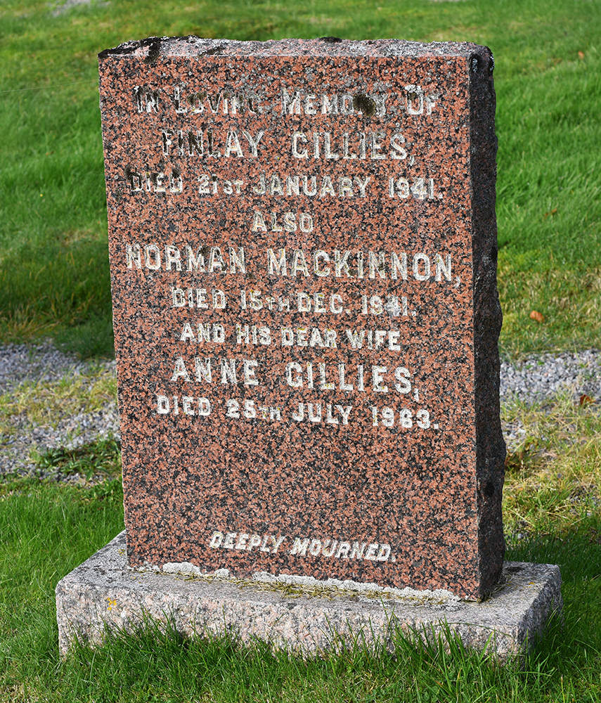 In loving memory of / FINLAY GILLIES, / died 21st January 1941. / Also / NORMAN MACKINNON, / died 15th Dec. 1941. / And his dear wife / ANNE GILLIES, / died 25th July 1963. / Deeply mourned