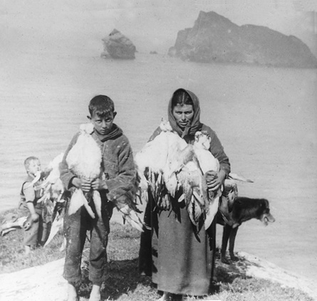 Annie Mackinnon ms Gillies, with son Finlay, bringing fulmar home from Conachair