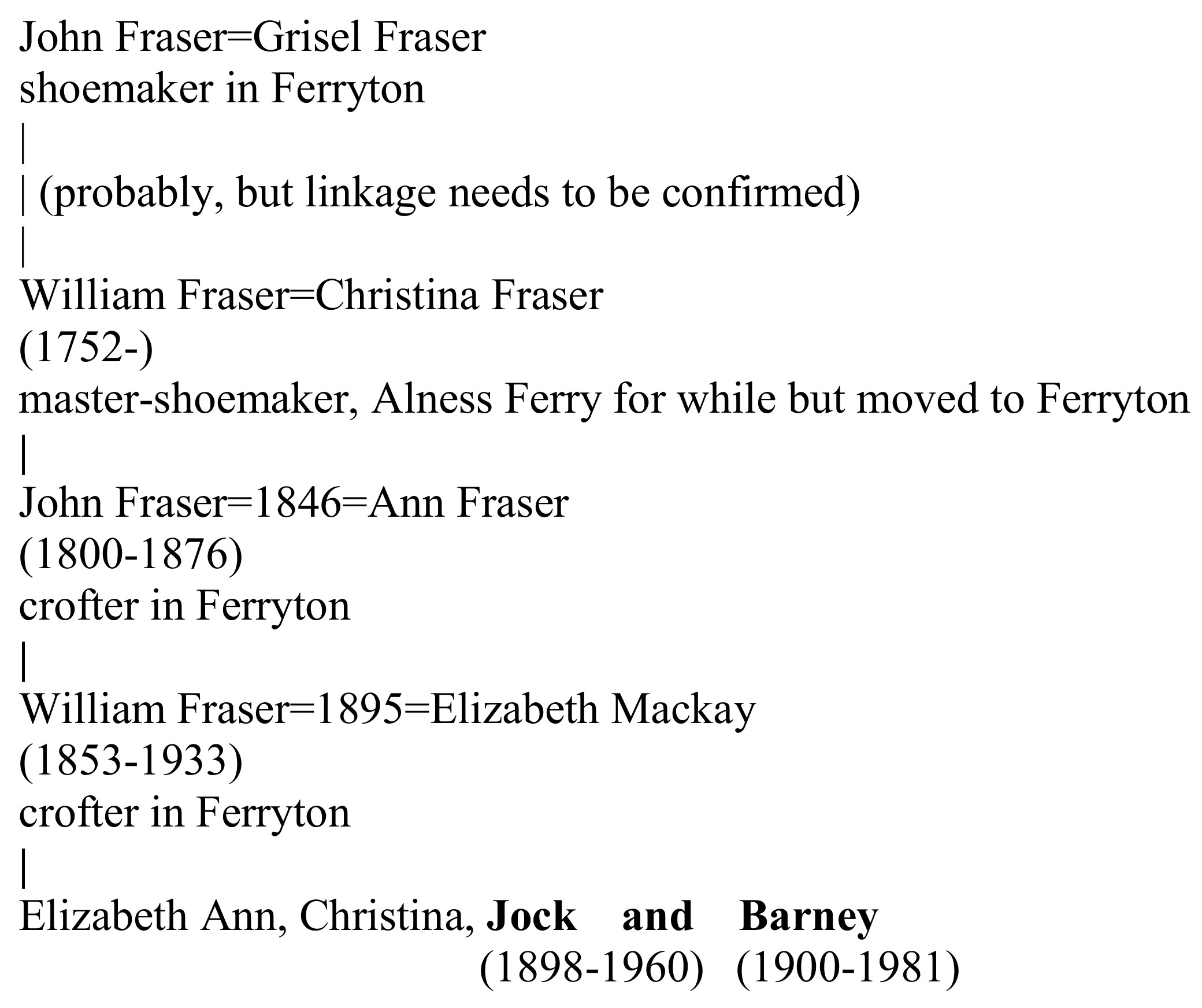 Barney and Jock’s lineage can be traced quite far back, and can be summarised in the tree below. That first generation is tentative – from the age of Willliam the master-shoemaker and from Scottish naming patterns it is likely (although confirmation would be useful) that the master-shoemaker’s parents were John Fraser, shoemaker Ferryton, and Grisel Fraser, who had children over the period 1749 to 1764. You can see that the forebears of Jock and Barney forebears never strayed far from Ferryton! The TF IF combination on the bowed stone, if they were truly the forebears of Jock and Barney, would have been the generation prior to John and Grisel but alas the usual records do not extend that far back!