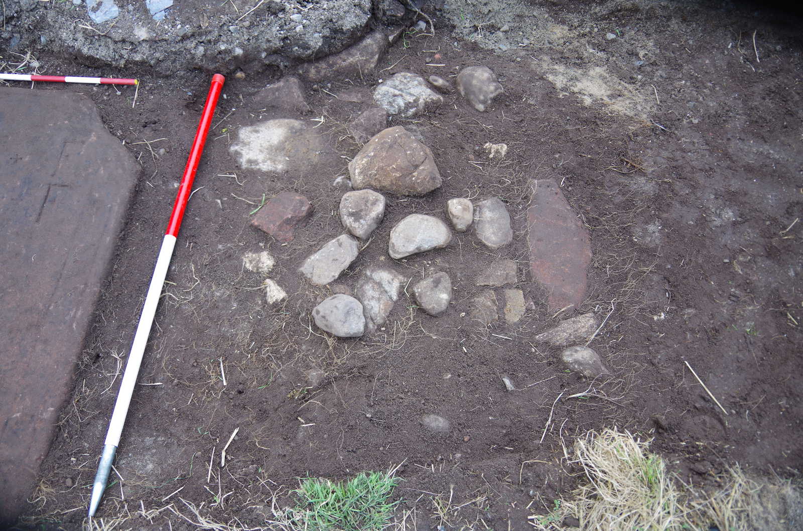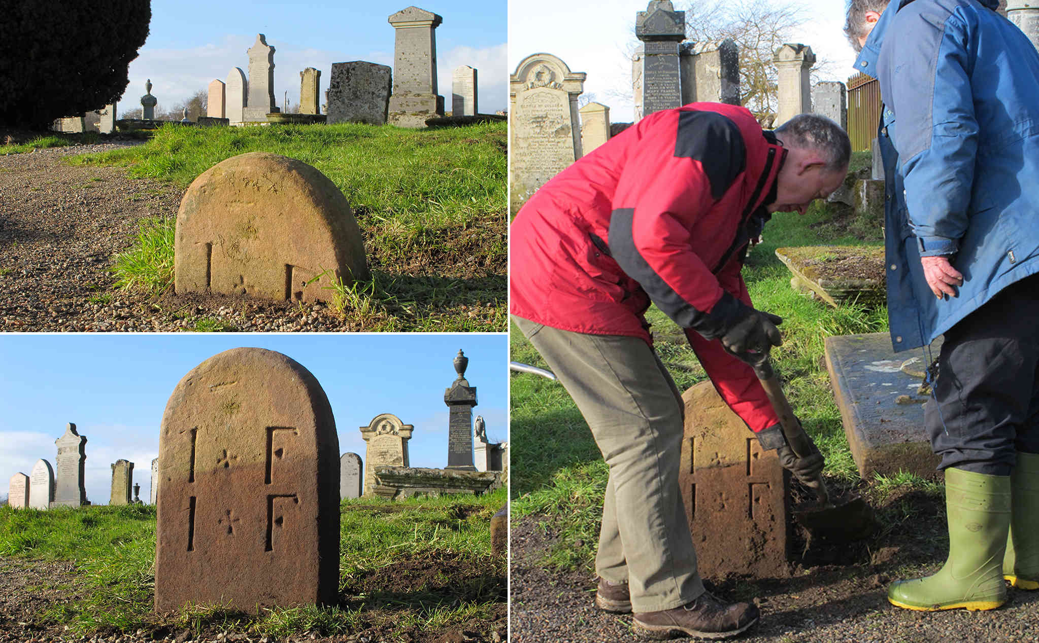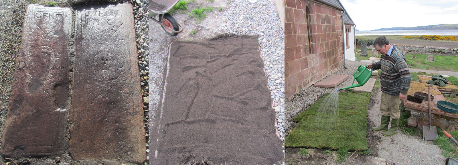 The pair of Fraser stones were partly exposed, badly worn and vulnerable due to location beside the path, so were recorded, covered in sieved soil and returfed. Photos: Jim Mackay and Carlann Mackay
