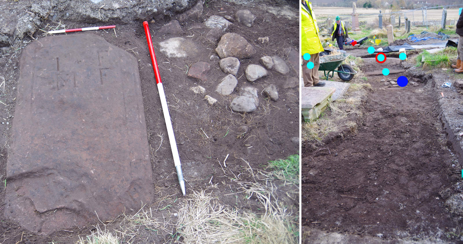 Left: the damaged Fraser slab lying adjacent to the original nave wall. Right: the new path to the nave door, with the location of the bowed stone (red spot with aquamarine centre), the nave wall (blue spot), and nearby Fraser stones (aquamarine spots) – sorry about your legs, Alastair! Photos: Lynne and Lachlan Mckeggie