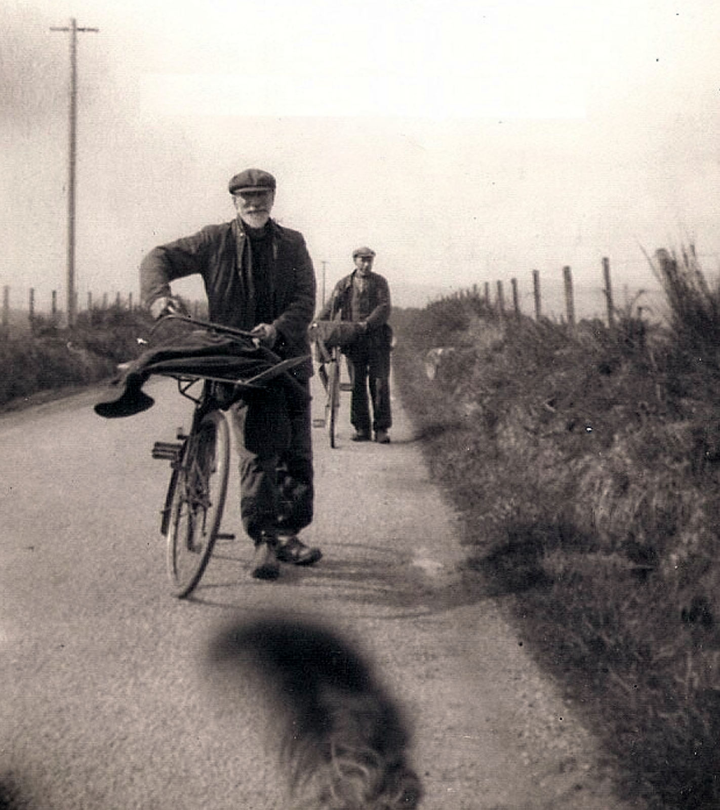 The had other talents. Barney could play the fiddle. The two brothers were fine rowers, and won prizes at the local Invergordon regatta. Jock had been in the Royal Navy – indeed, cousin James tells me that he has a photo of Jock in sailor’s uniform, possible during the First World War. At time of writing (2019), their boat, the Ladybird, still lies, disintegrating into the soil, beneath some trees outside their house. The brothers sometimes fell out, and would cycle to work with a gap between their bikes. But usually the pair and their dog would be seen cycling along together with their collie Frankie (all their collies were called Frankie) running beside them and with their tools on a support below their handlebars. The following two pictures are courtesy of Robert Carson, nephew of Jock and Barney.