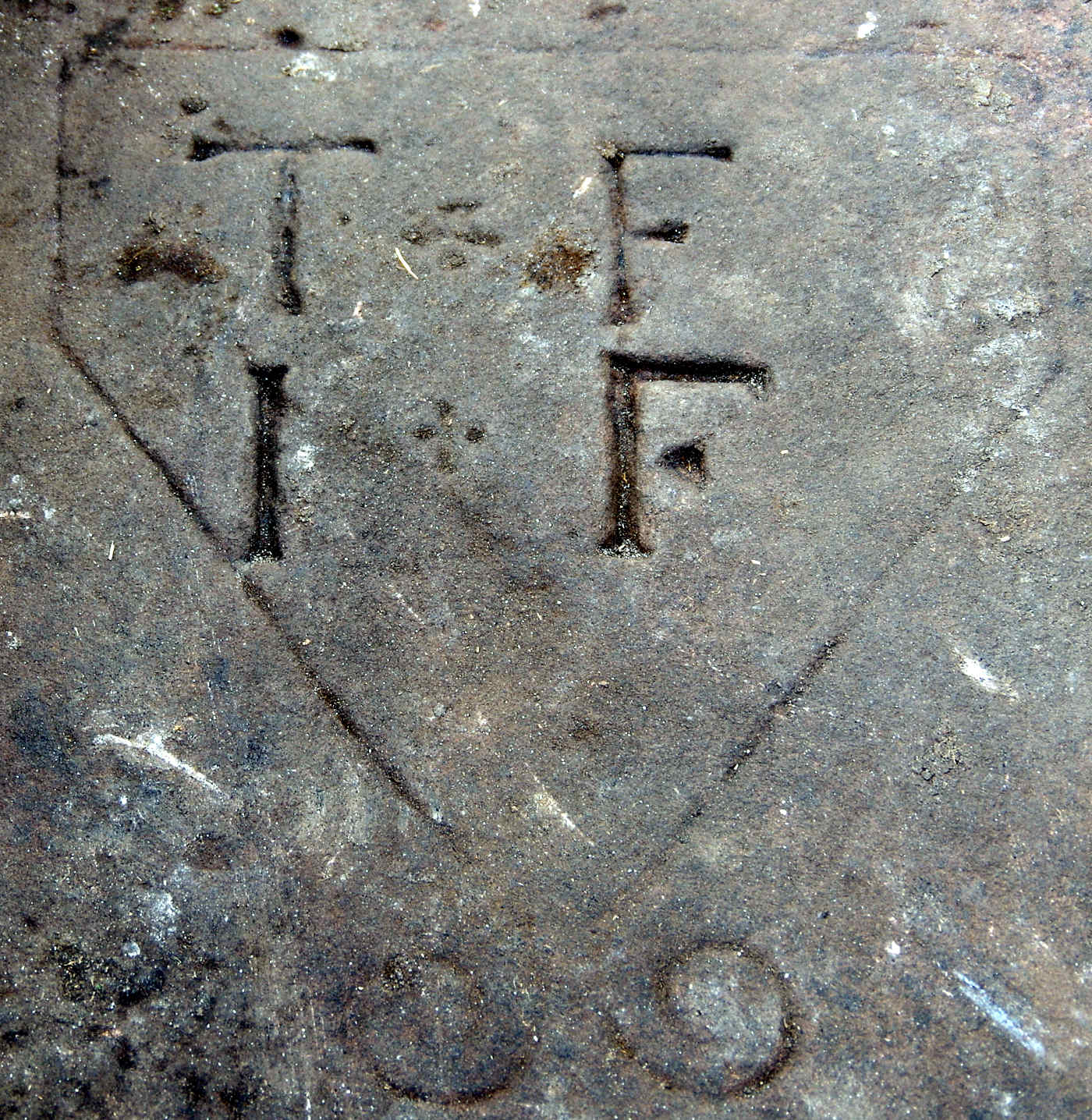 Adjacent to the bowed stone, to the north, there is no slab, but at the head of the gap is a beautiful small headstone (seen below) with the initials I + F / I + F. This headstone was so deeply sunk that it was being damaged, so in 2018 the Trust brought it up to its original depth. (On these old stones, the section that was intended to be buried was not shaped, and the soil was just brought over the level of the undressed stone.)