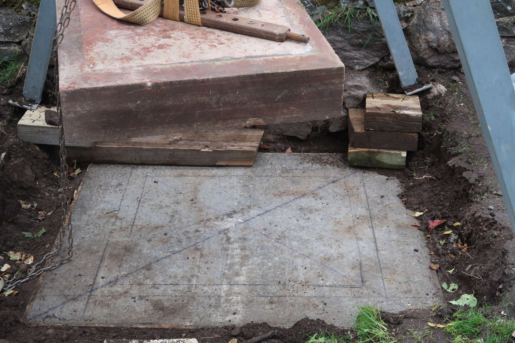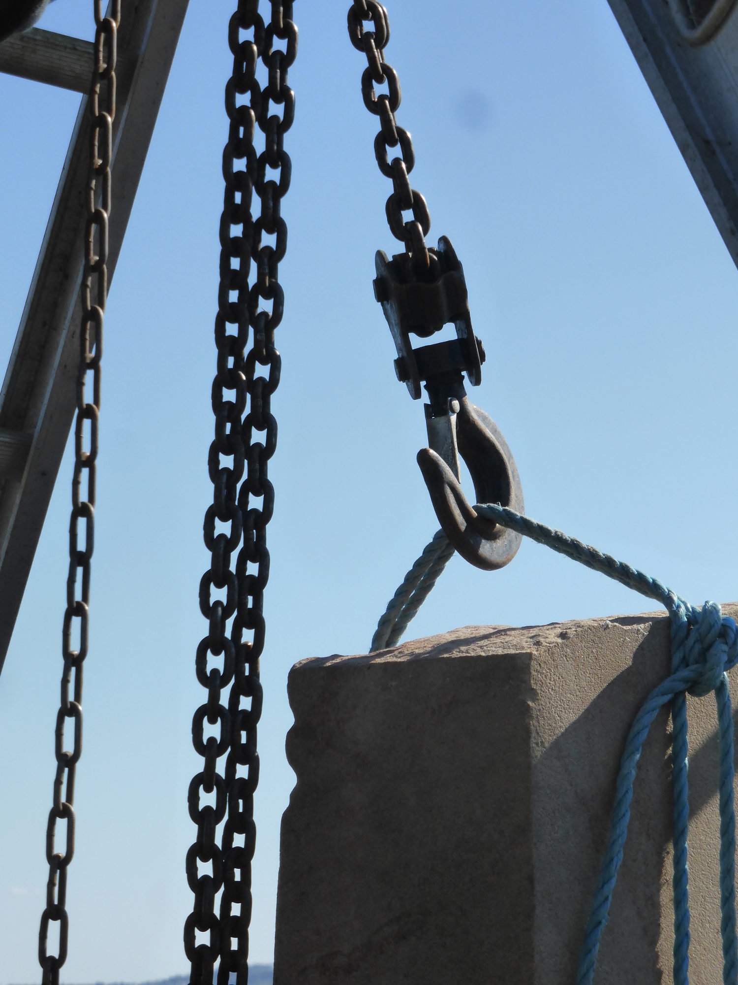 The first step was to relocate temporarily the base of the monument in order to lay a proper foundation. We somehow managed to create enough space under the plinth to slide a strap under each side. With lots of knots and loops the Kirkmichael Gantry lifted all four base pieces as one and we shifted the structure out of the way. As suspected, the base slabs were as poorly joined as the Needle itself and a couple separated during the operation, revealing that they had no securing pins either.