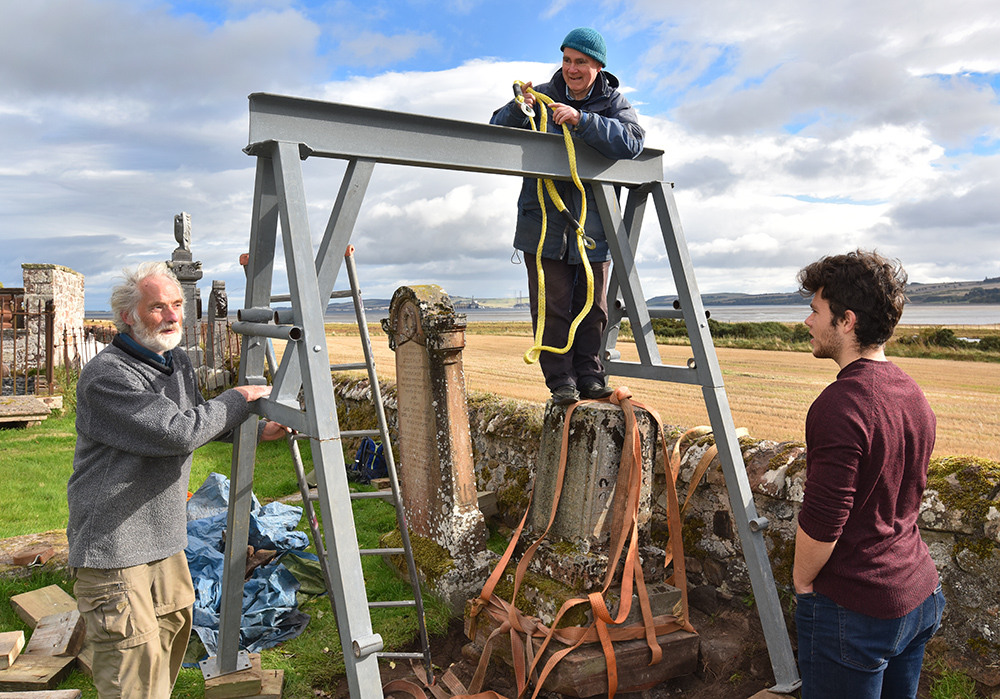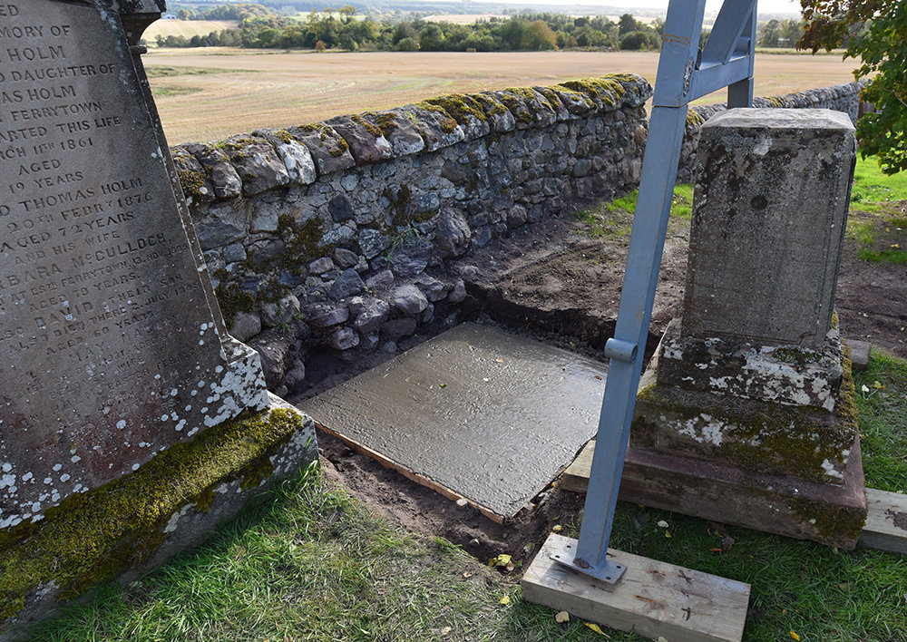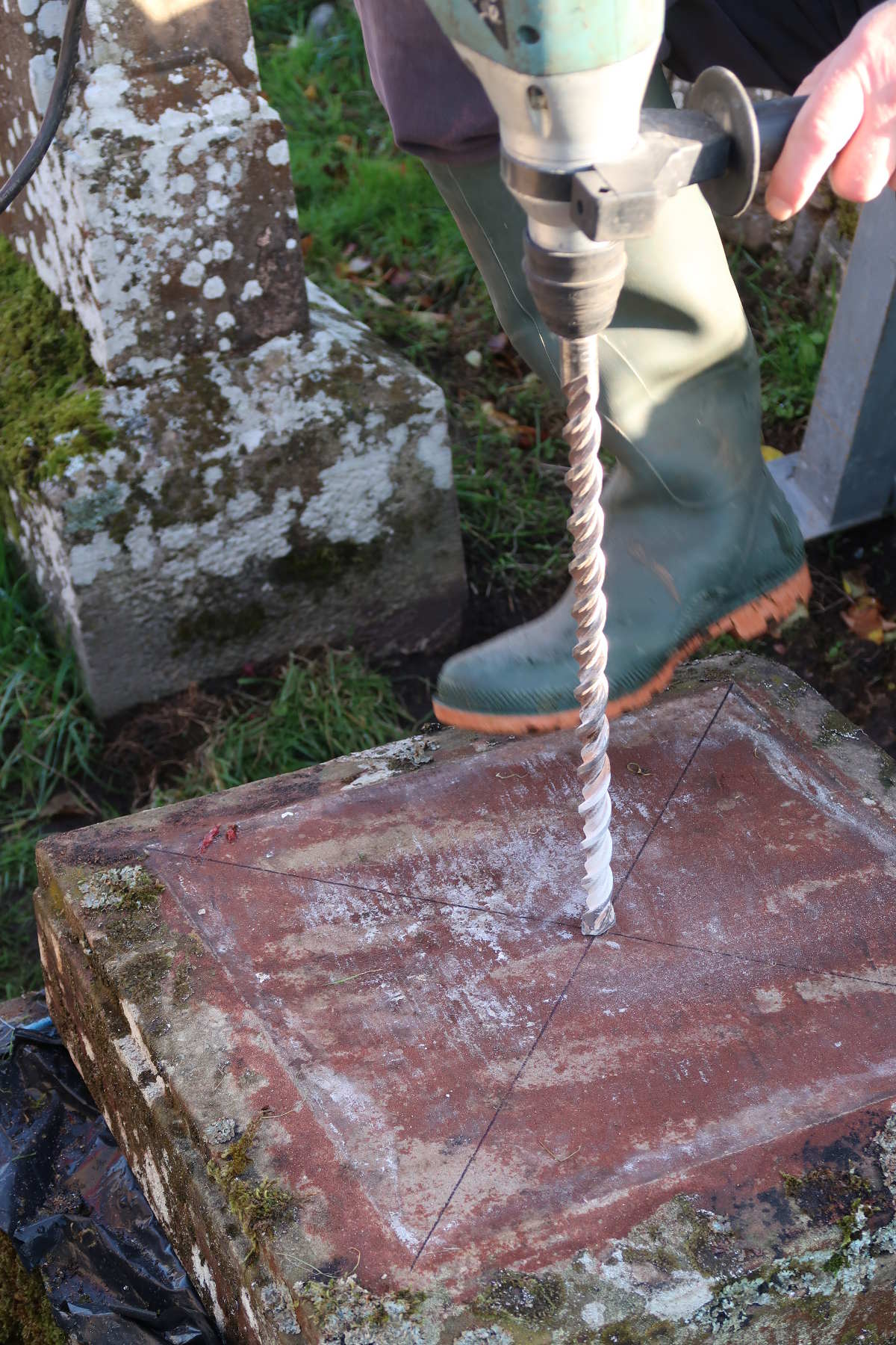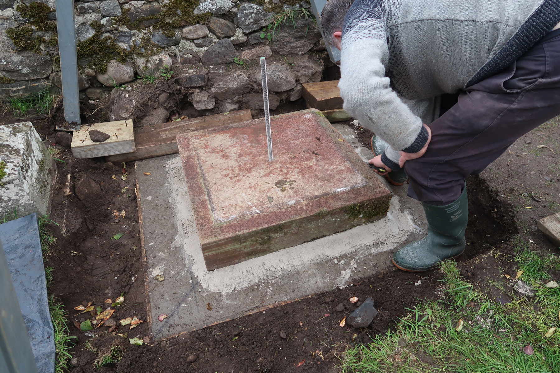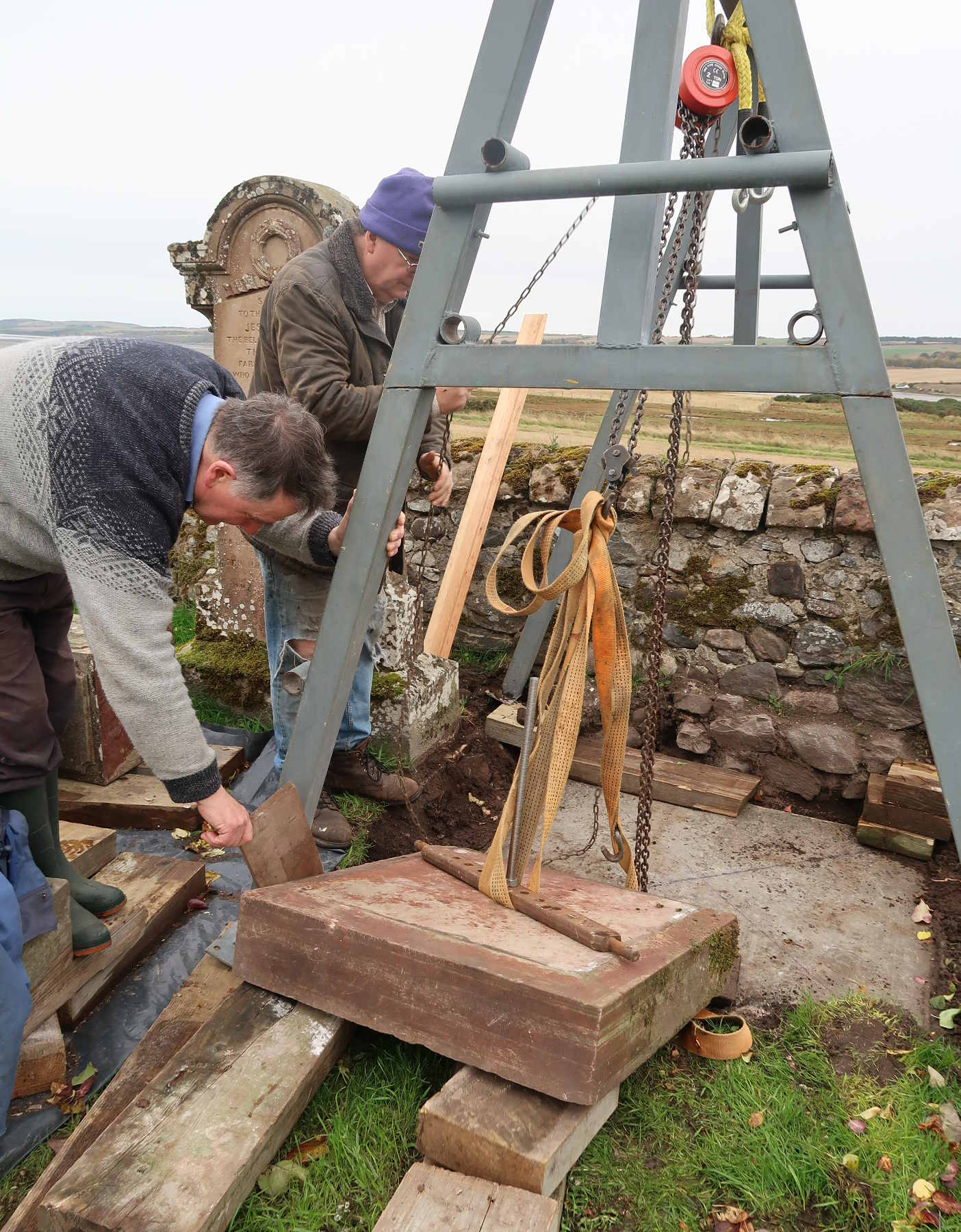 Back in the kirkyard, the supporting slabs were drilled and pinned. With a Massey-Ferguson drawbar attached to the pin, the base slab could be swung into position.