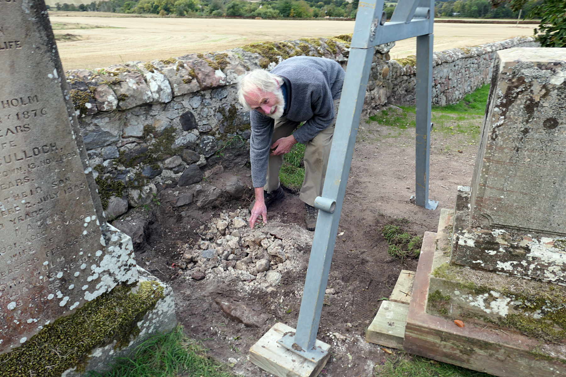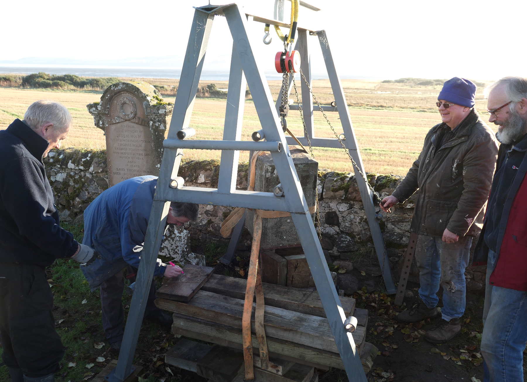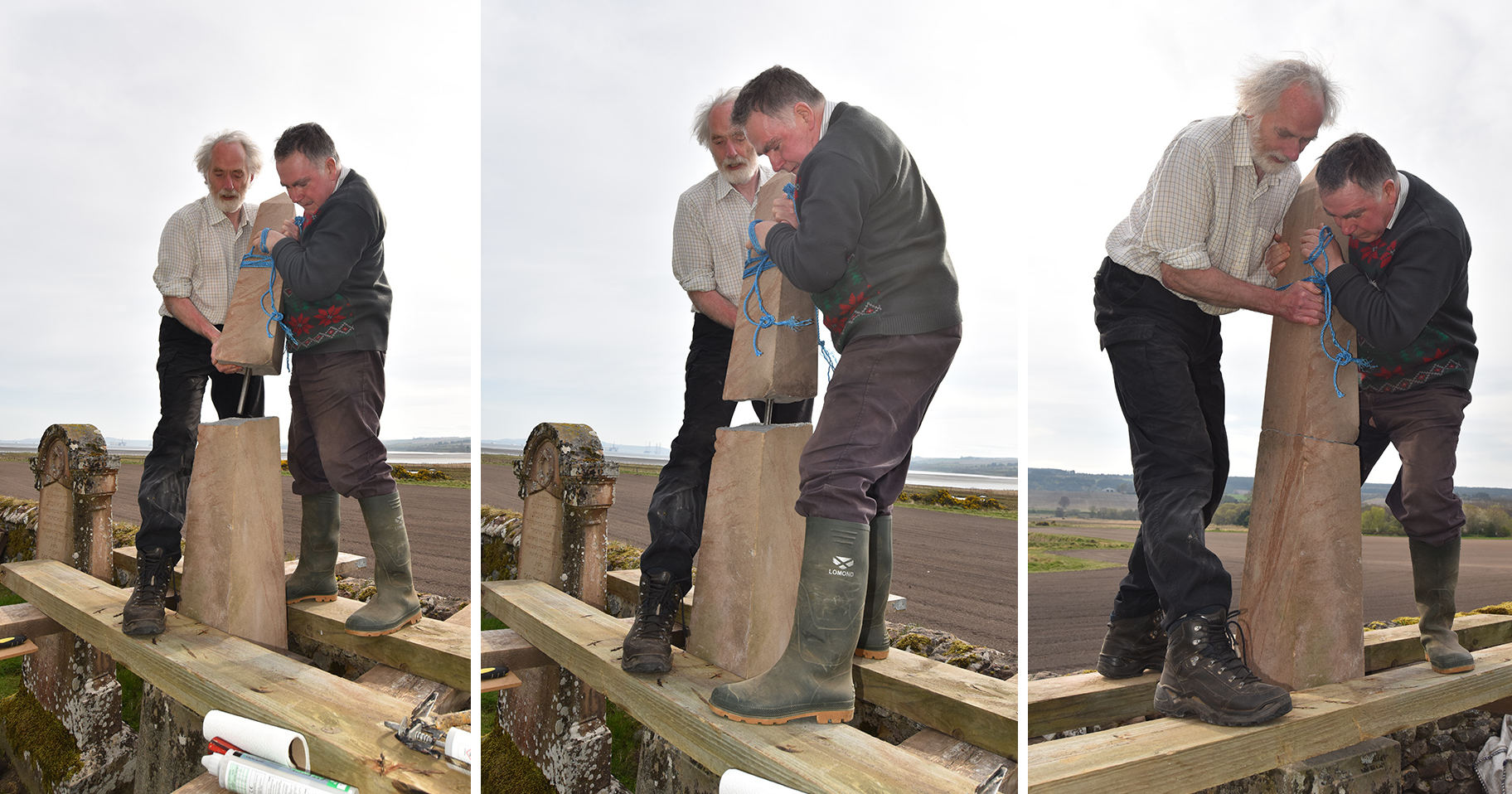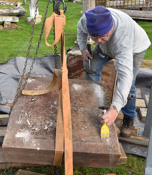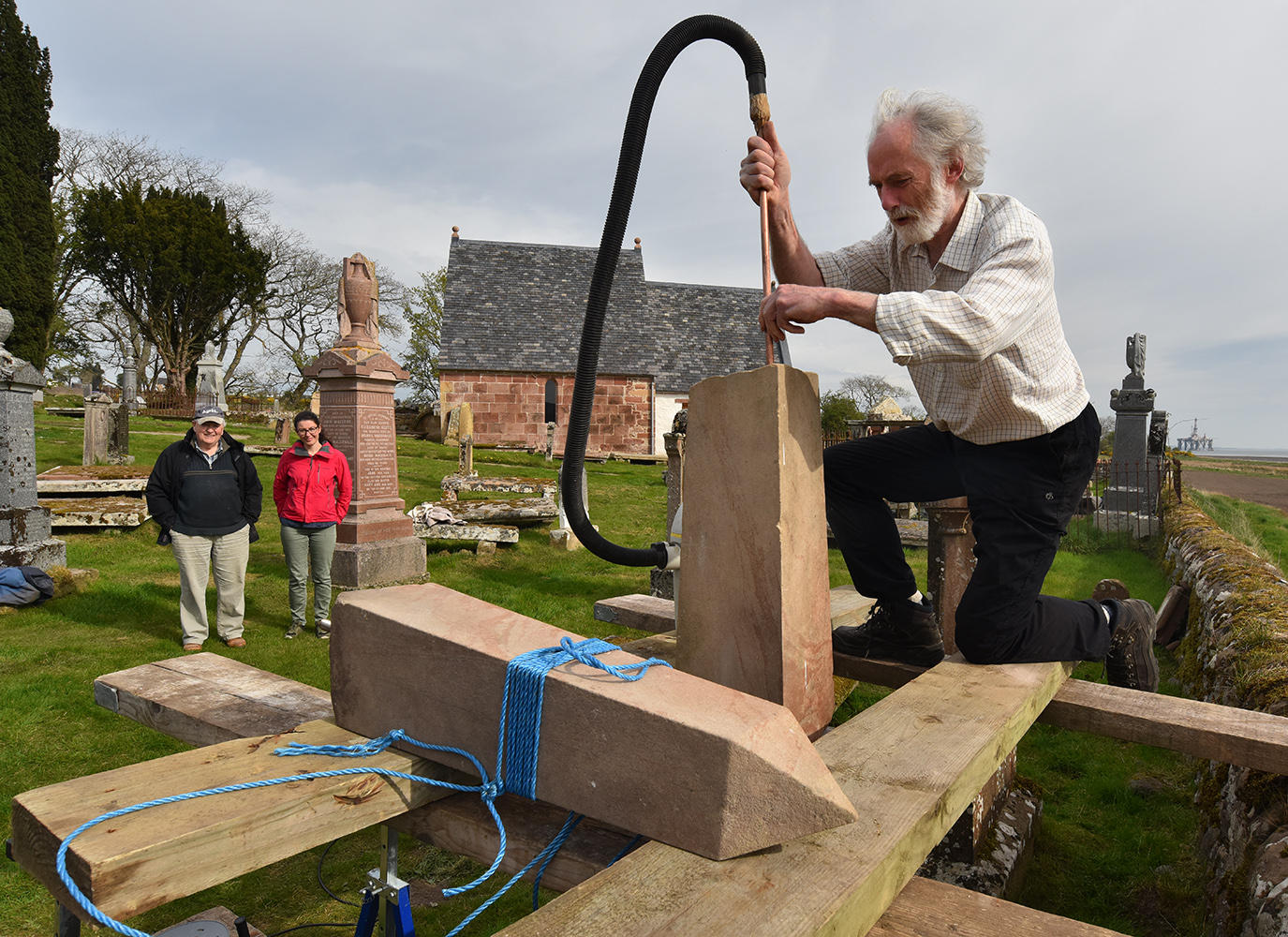 Back in the kirkyard, the supporting slabs were drilled and pinned. With a Massey-Ferguson drawbar attached to the pin, the base slab could be swung into position.