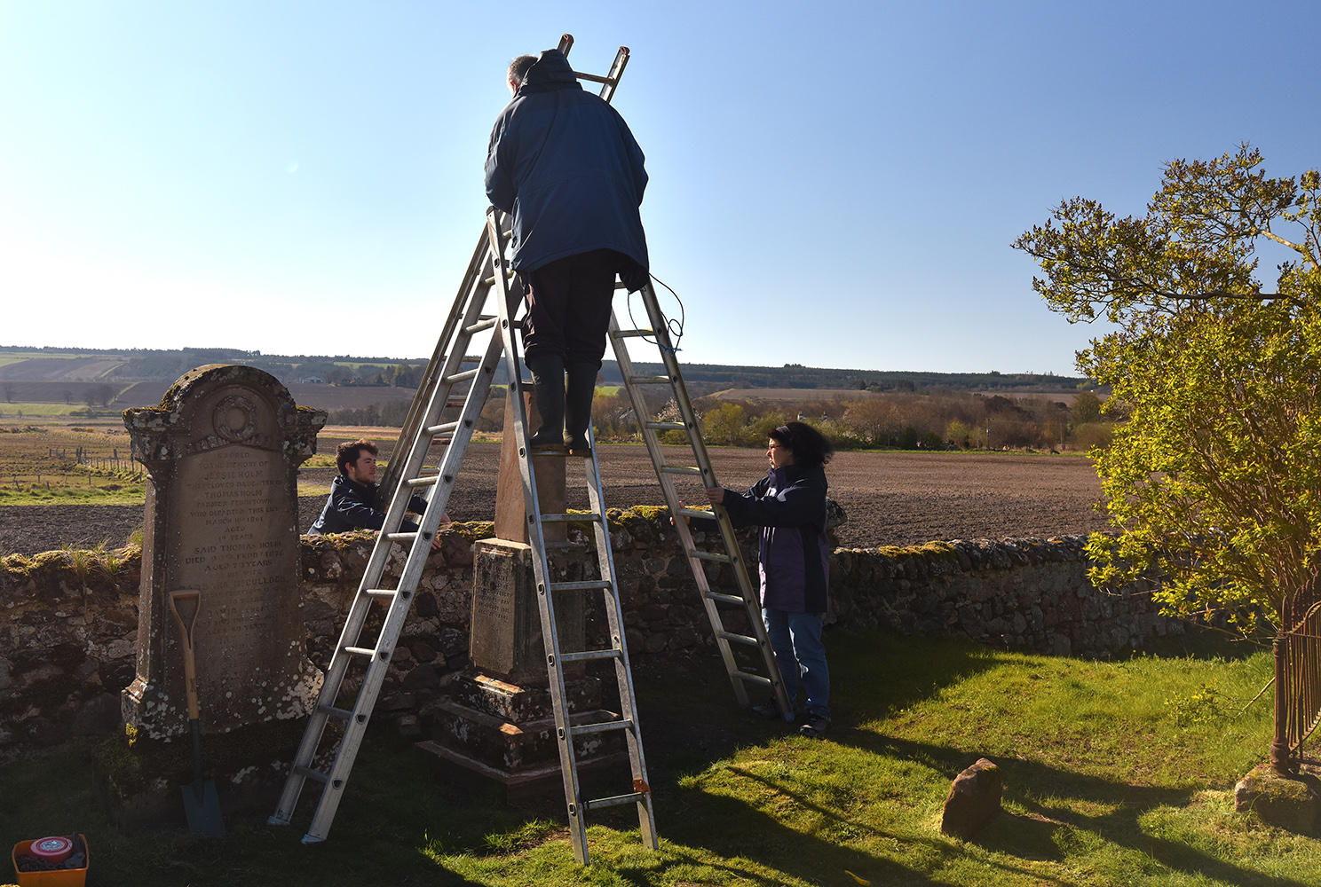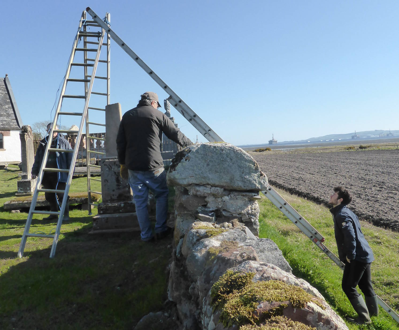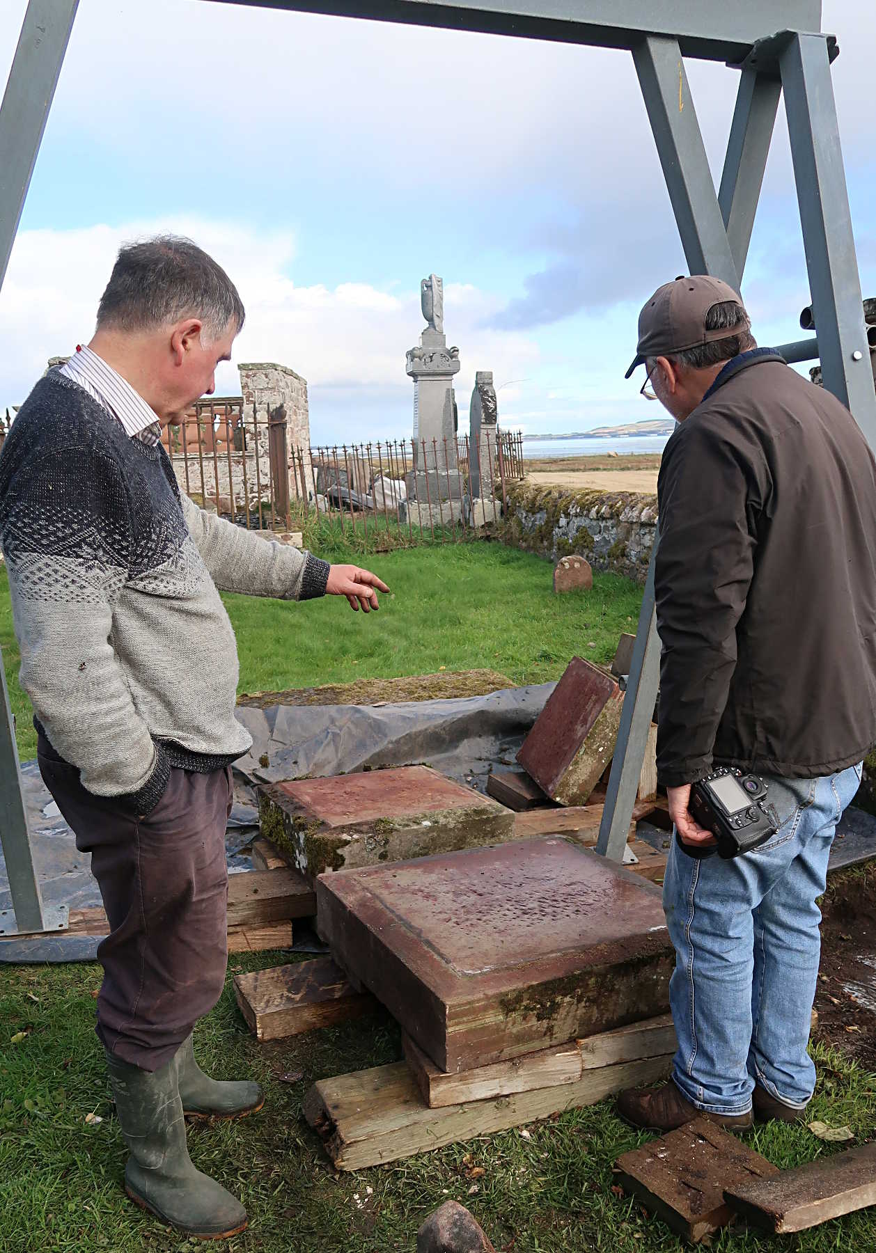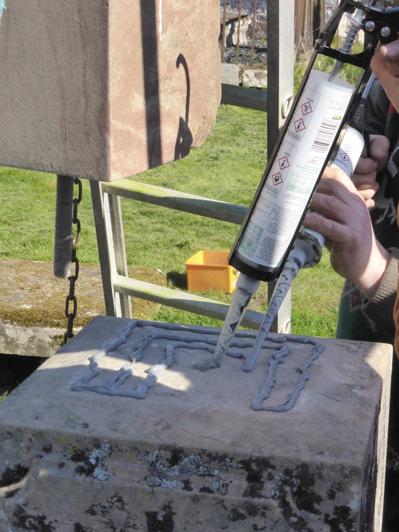 Back in the kirkyard, the supporting slabs were drilled and pinned. With a Massey-Ferguson drawbar attached to the pin, the base slab could be swung into position.