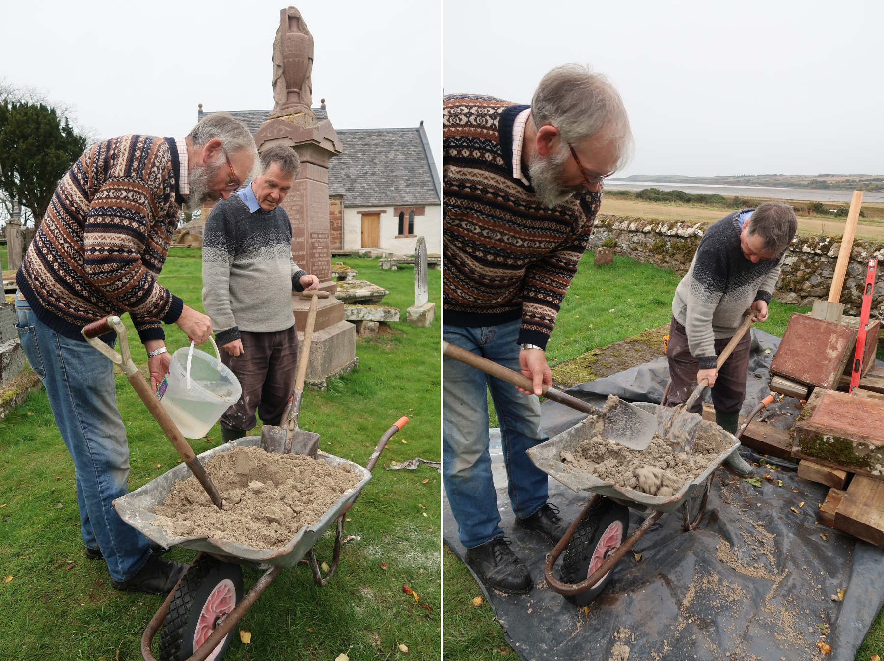 Lime mortar being mixed in the Kirkmichael wheelbarrow.