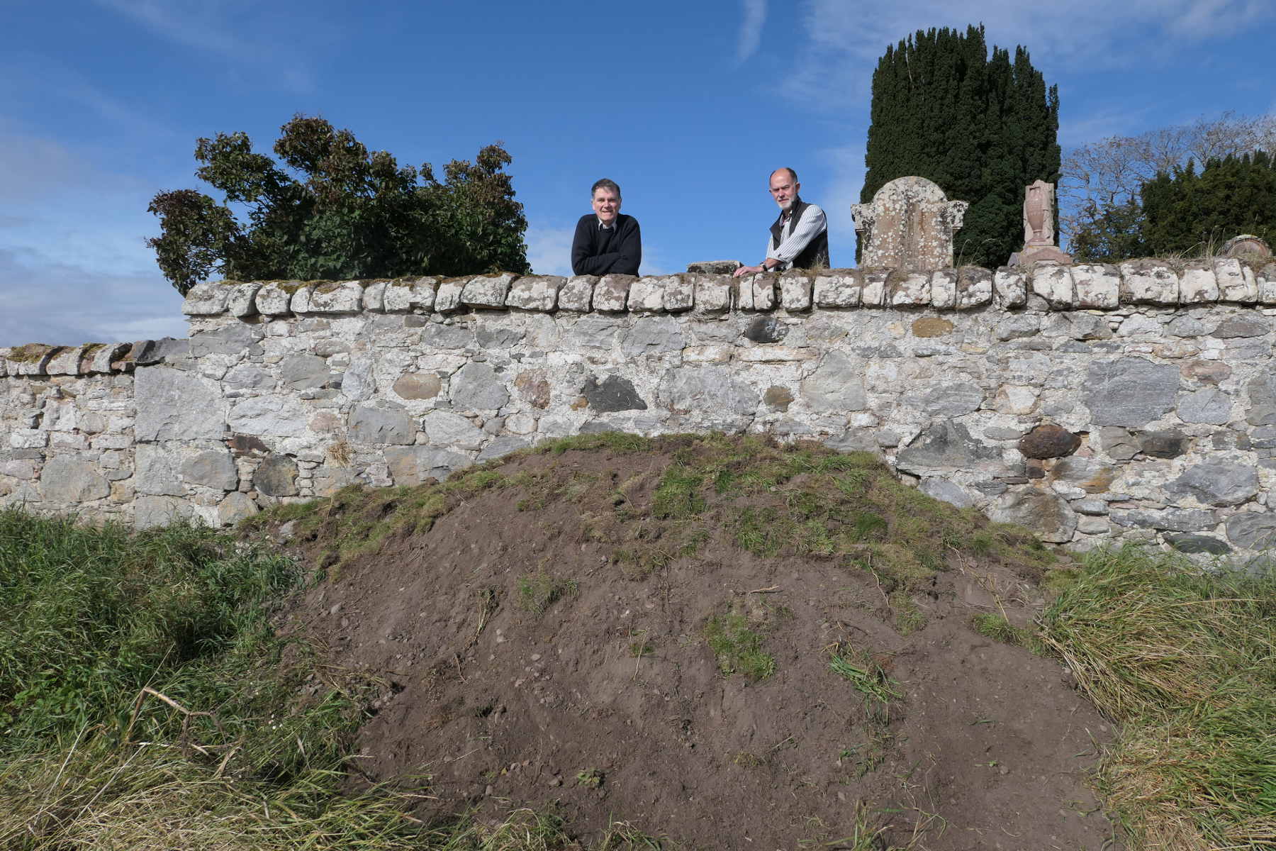 As ever at Kirkmichael we created a solution from two problems. The mound of surplus soil and stones deposited by the gravediggers in that area of the kirkyard was removed and built up on the outside of the dyke, both relieving the pressure on the inside and stabilising the dyke from the outside. We re-sowed the area we had levelled. And we re-turfed the mound to make it inconspicuous. The dyke could really do with the same treatment along all its southern extent to avoid eventual collapse.