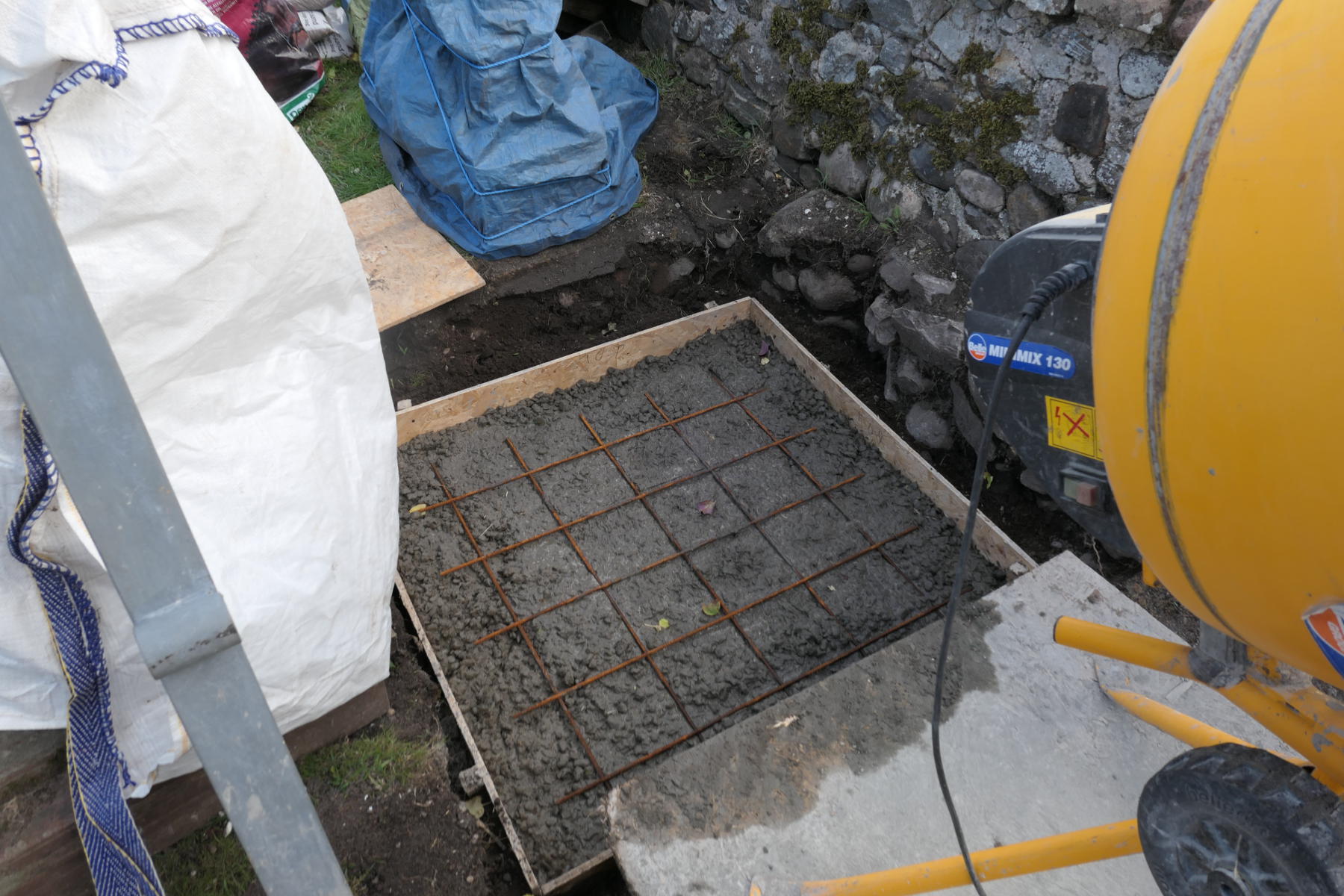Concrete mixed on site, with covers over adjacent stones lest there be splashes.