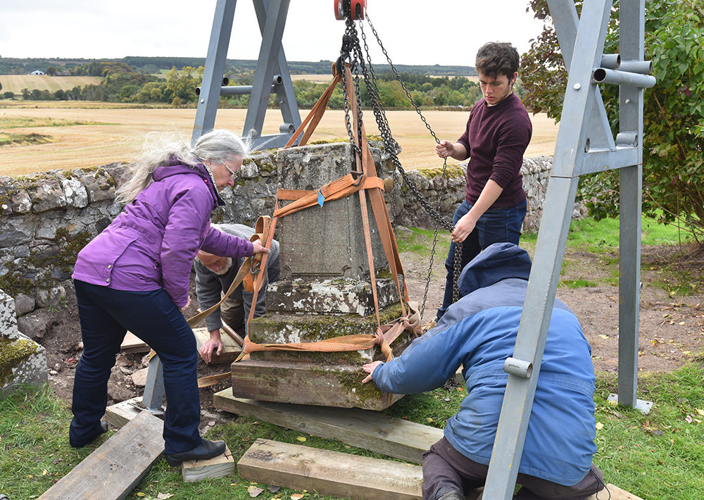 The remaining section lay for some time at 45 degrees on the support and against the dyke, and was then jammed in behind the supporting block, along with a much older stone baluster which we wrongly assumed was part of the structure. And so things remained until 2018. The Trust having successfully put the buildings at Kirkmichael back in order was now seeking to fix the broken memorials.