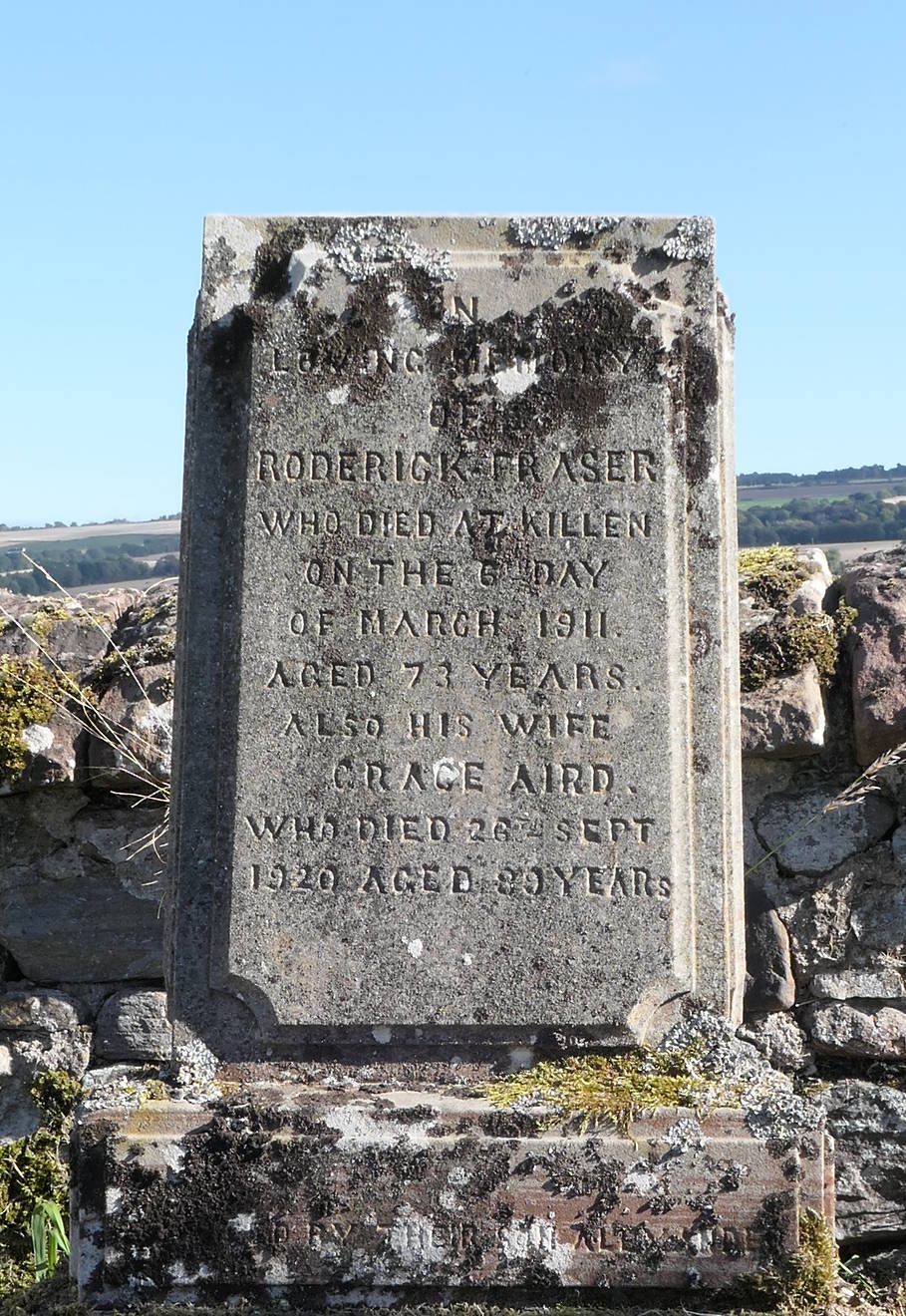 The inscription on the memorial reads, on the north side of the attractively designed sandstone block that supported the Needle: "In / loving memory / of Roderick Fraser / who died at Killen / on the 6th day / of March 1911 / aged 73 years. / Also his wife / Grace Aird / who died 26th Sept. / 1920 aged 89 years". On the slab that supports the main inscription block, on the north side: "Erected by their son Alexander". And on the east side of the main inscription block: "Also / of their daughter / Catherine, / who died at / Wester Raddery. / on the 29th day / of August 1903. / aged 28 years."