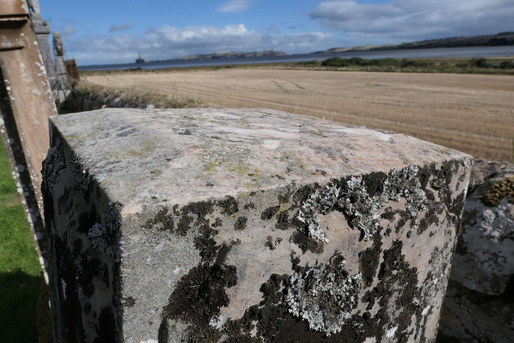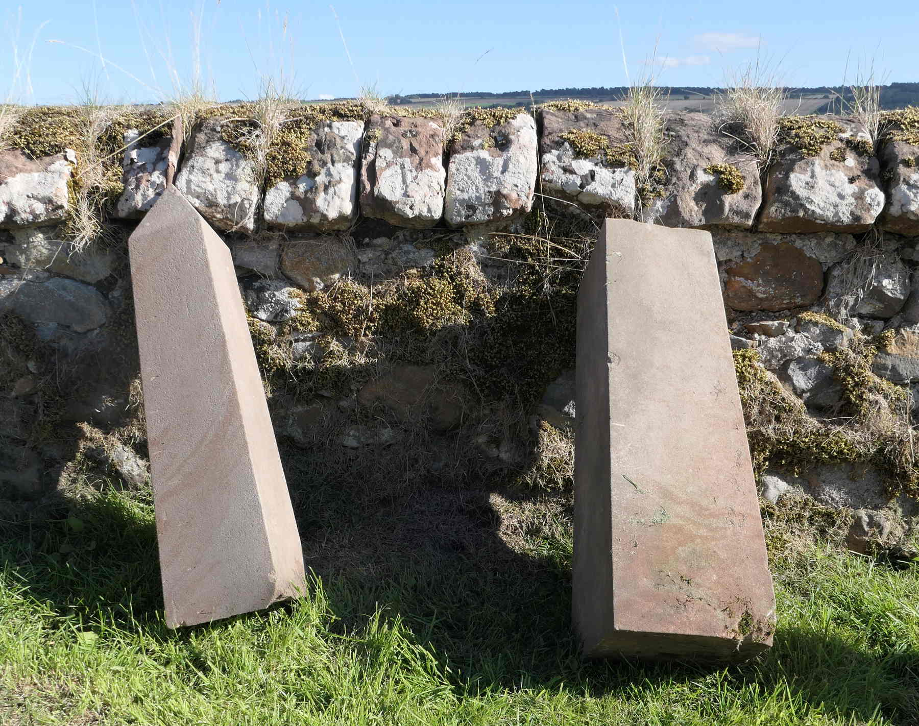 The memorial itself was set very close to the south dyke, and with the dyke leaning outwards due to the soil being perhaps five feet higher on the inside than on the outside, the memorials in that locality tilted outwards as well. The adjacent one was re-laid a couple of decades ago by the Holm family of Ferryton as a precautionary measure. In photos of the period, you can just see the obelisk tilted over alarmingly. The Needle parted company from its supporting slab, perhaps in a gale, and tumbled down to smash against the dyke. It broke into two pieces and (as we eventually realised) the pointed end tumbled over into the field.