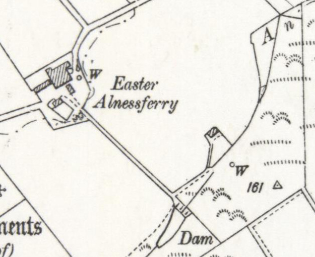 The origins of the dam go back a long way. In 1920 Walter Macdonald, a butcher, lived at Easter Alness Ferry. Dad told me: “Before the Macdonalds down there were Stewarts. Willie Stewart was a great man – had a mill with wheels – built the dam up there. Andra’ Wullie’s [father of Hector Robertson] mother’s folk. The Stewarts died out.” Although some distance away, the mill at the farm steading was driven by power from the dam. The farmer would release the water stored in the dam to transfer power by a series of belts and pulleys all the way down to the steading at Easter Alness Ferry.