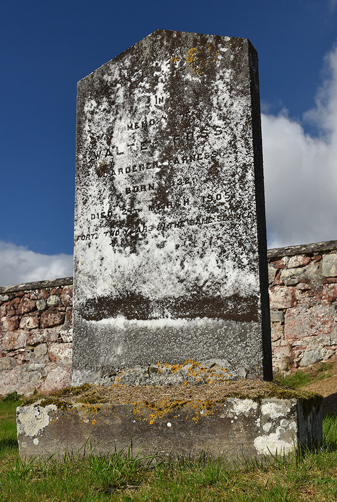 That name of “Gregor” from Gregor Kemp was to recur several times in the family line of Frasers, and in other branches. A white marble headstone in the modern section of Kirkmichael commemorates Walter Ross, who married Helen Fraser, daughter of Roderick Fraser and Flora Kemp, and they named one of their sons Gregor. I note, by the way, that Helen died in Jemimaville in 1916 and I imagine she is buried in Kirkmichael although there is no mention of her on the gravestone. Indeed, there is very little about her in the eulogy in the Ross-shire Journal of 31st March 1905 following her husband’s death: